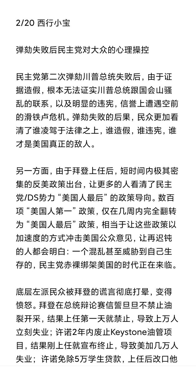 小宝的最新分析,推荐给大家。弹劾失败后民主党对大众的心理操控。