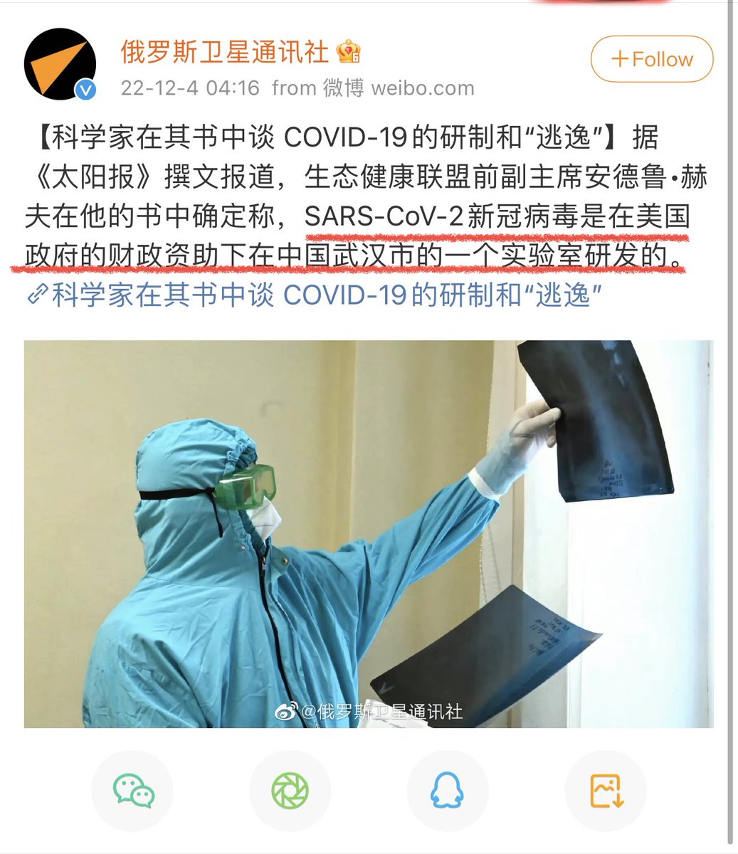 伤敌一千自损一万说实话,在墙内说新冠是武汉实验室逃逸的,也就俄罗斯媒体能发出来,其他发了不是秒没?