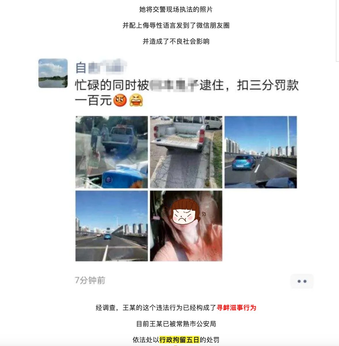 江苏省常熟市女子王某,因发布朋友圈称警察为日本鬼子,被认定为辱警并被拘留5日。