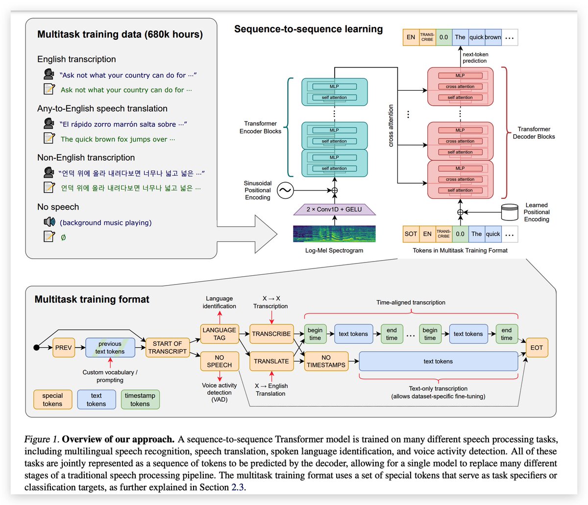 关于 Whisper 模型,《Robust Speech Recognition via Large-Scale Weak Supervision》,https://t.co/sidAah1kwb,这篇论文给出了详细的分析,从架构设计来看,它是一个标准的 Transformer encoder-decoder 架构,没有增加大的创新,之所以效果如此好,主打一个“大力出奇迹”。