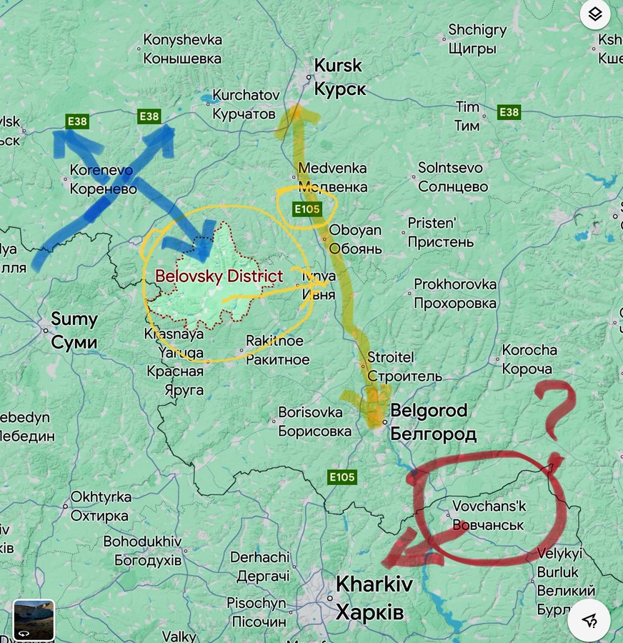 #乌克兰战报 俄罗斯境内 Kursk昨晚,别洛夫斯基区发生战斗。随着战斗的发生,乌克兰一个旅今晚已进入库尔斯克地区的别洛夫斯基区。结合波罗兹附近的🇺🇦第 252 营的照片,看来,乌克兰的战略是,威胁通往沃夫昌斯克的 E105 高速公路(俄罗斯后线),并威胁在哈尔科夫方向的俄罗斯部队。