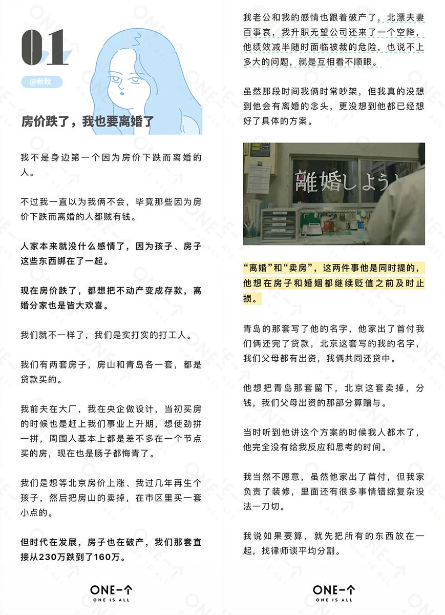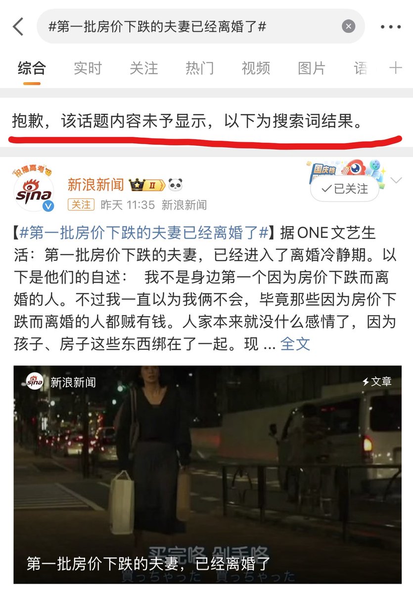 10月21日,媒体“one一个工作室”采访了几名因房价下跌而离婚的夫妻,本来房价下跌就非常让人受伤,再加上夫妻矛盾更加令人破防。夫妻本是同林鸟,房价下跌各自跑,第一批房价下跌的夫妻,已经进入了离婚冷静期。目前微博话题#第一批房价下跌的夫妻已经离婚了#已被平台封禁。