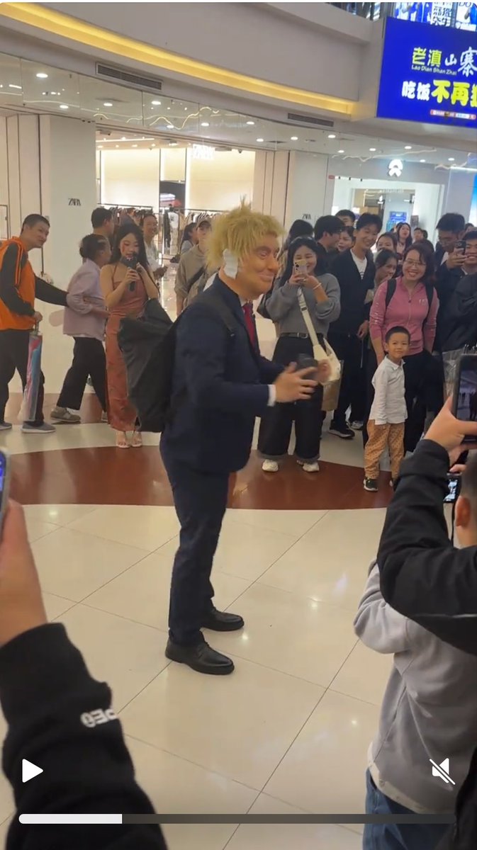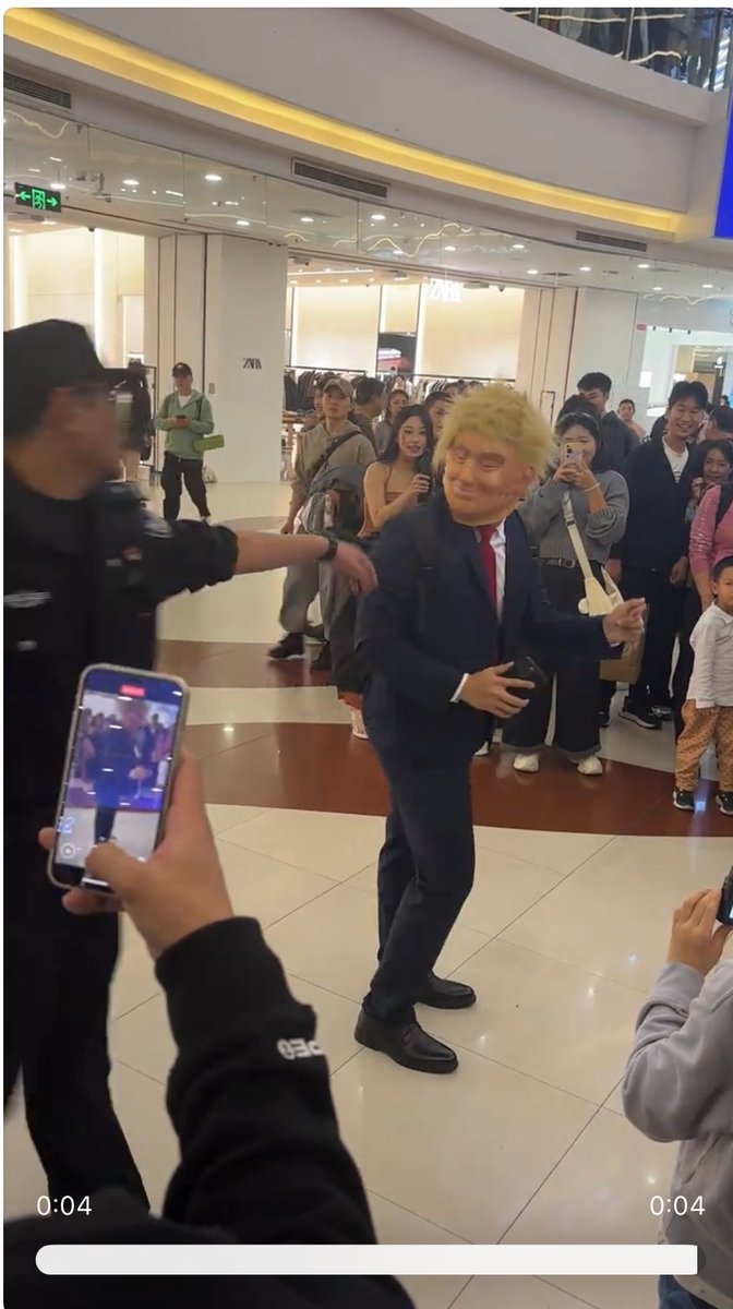 10月2日晚,上海。男子在商场cos特朗普 随即被保安制止。