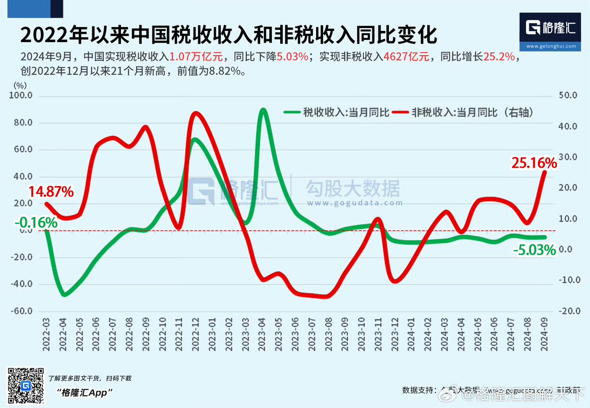 10月30日,据“格隆汇”数据: 2024年9月,中国税收收入1.07万亿元,同比下降5.03%; 非税收入4627亿元,同比增长25.2%,再创新高。