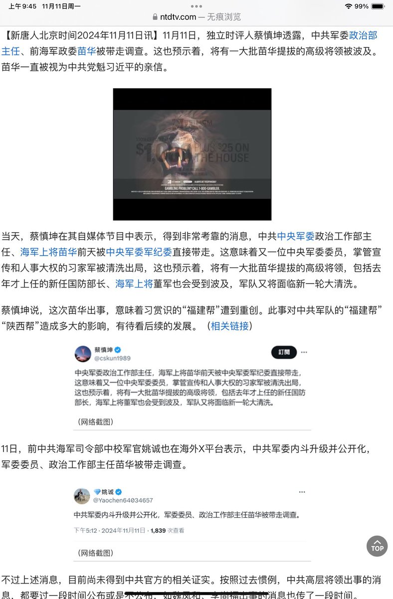 💥网传,共匪伪中央军委政治工作部主任、海军上将苗华前天被伪中央军委军纪委直接带走。这意味着又一位共匪伪中央军委委员,掌管宣传和人事大权的习家军被清洗出局,这也预示着,将有一大批苗华提拔的高级将领,包括去年才上任的新任伪国防部长、海军上将董军也会受到波及,军队又将面临新一轮大清洗。