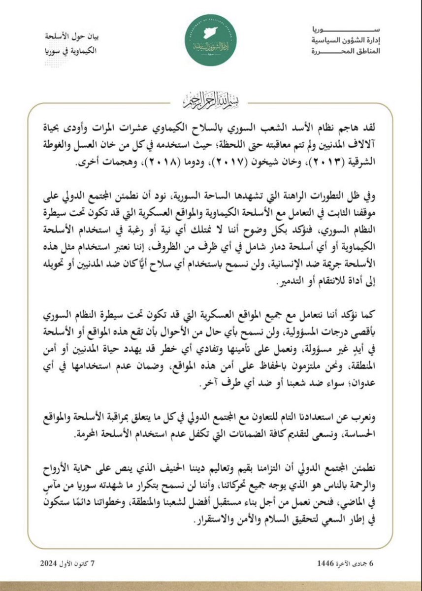 最新消息:HTS发布声明说完全准备好与国际社会合作监测阿萨德的化学武器