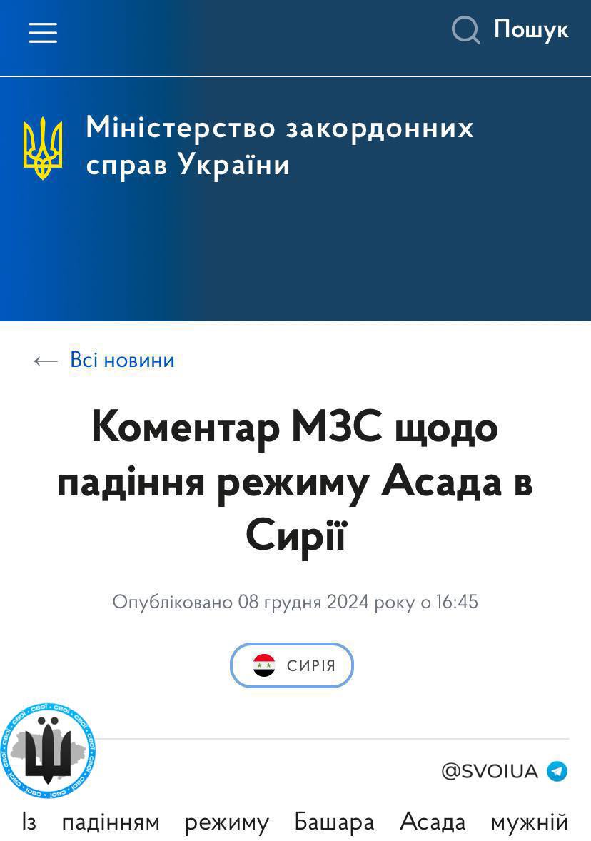 烏克蘭外交部不反對與敘利亞恢復關係我們希望敘利亞未來成為一個尊重國際法、特別是烏克蘭領土完整和主權的國家,這將為恢復雙邊關係以及基輔和大馬士革之間的全面政治對話鋪平道路。