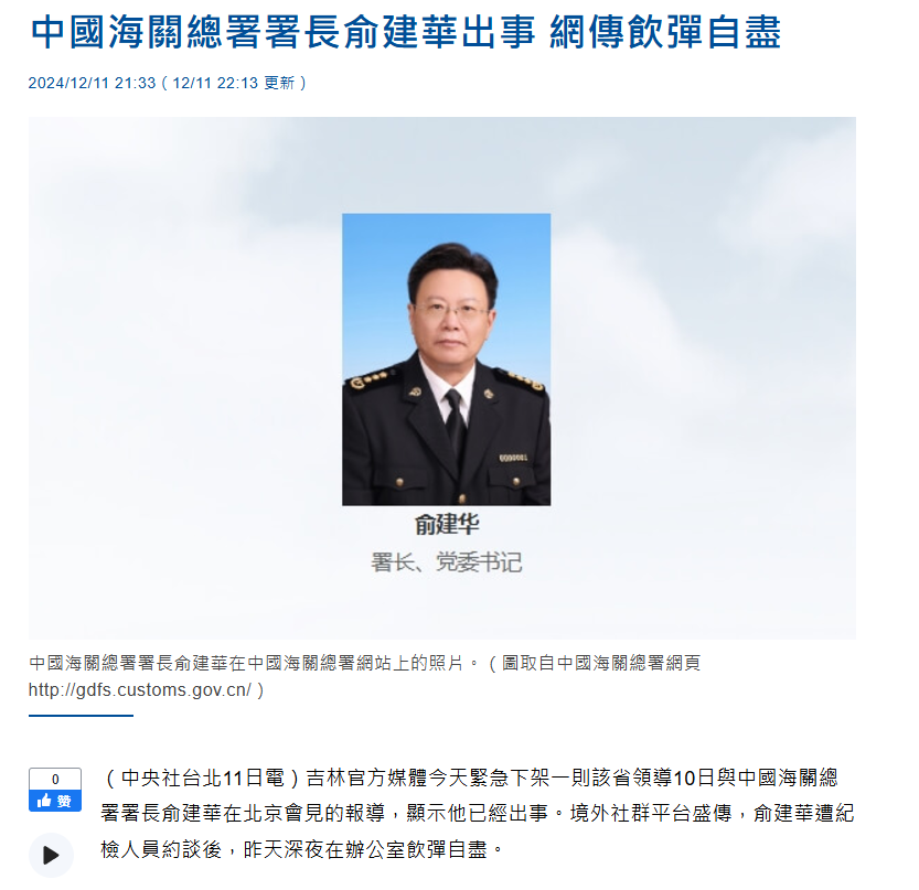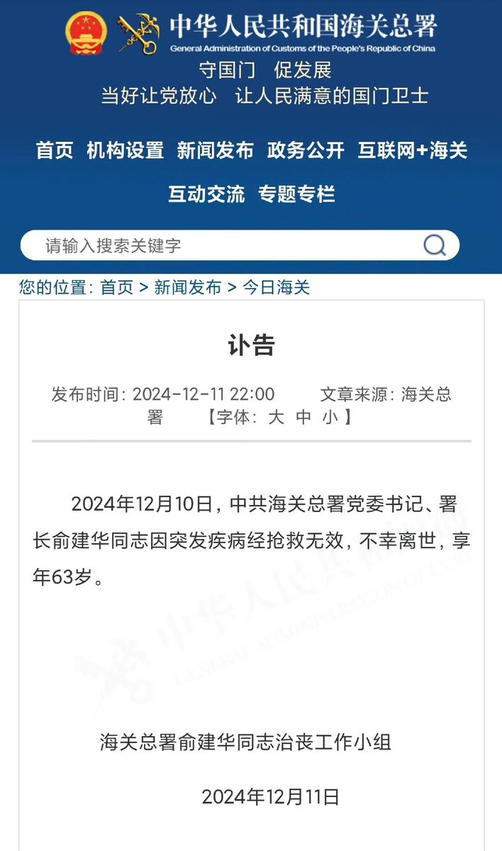 中国海关总署: 12月10日,中共海关总署党委书记、署长俞建华因突发疾病抢救无效去世,享年63岁。 而此前外界盛传俞建华遭纪检人员约谈后,昨天深夜在办公室饮弹自尽。