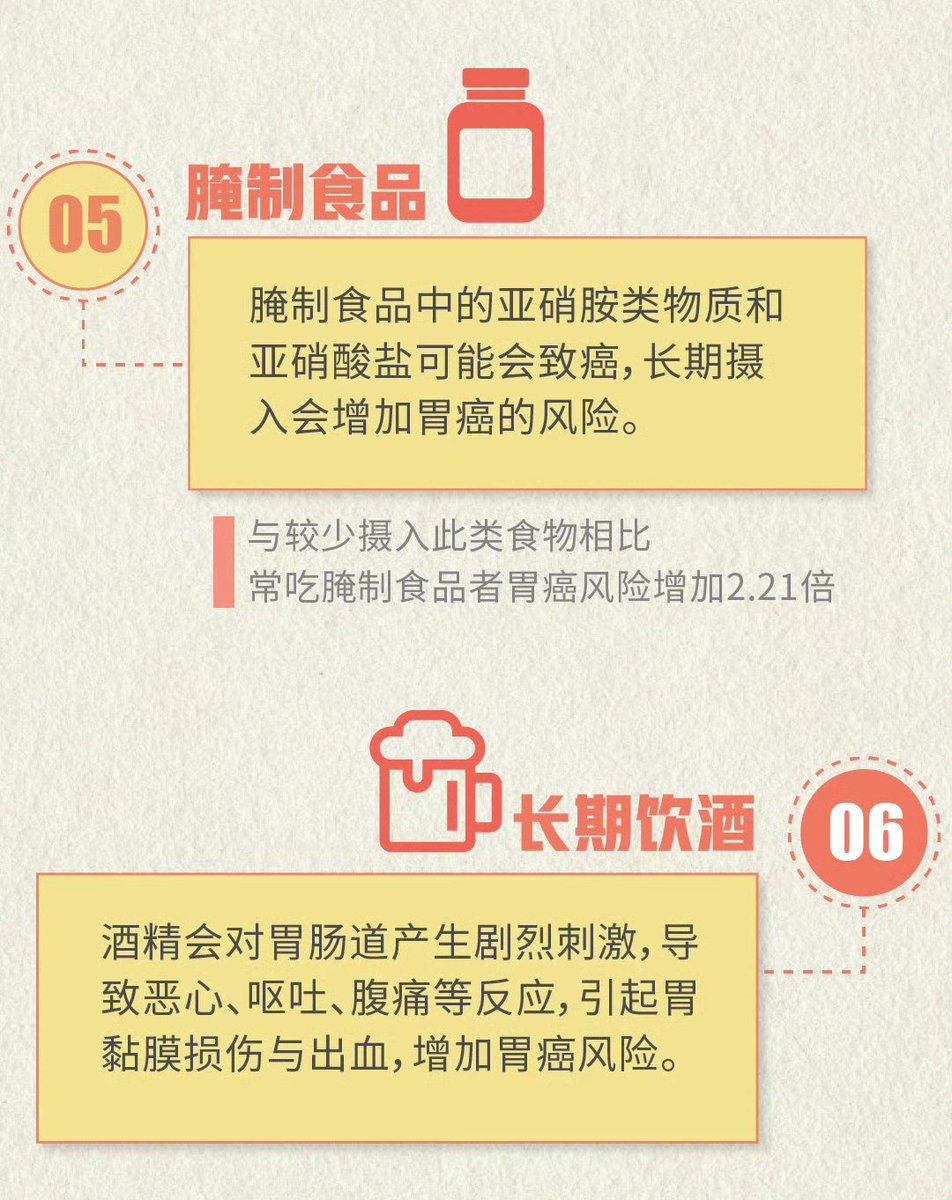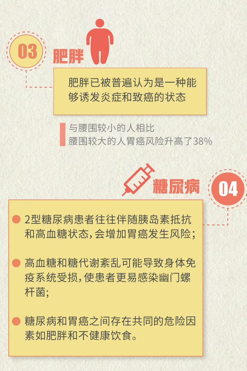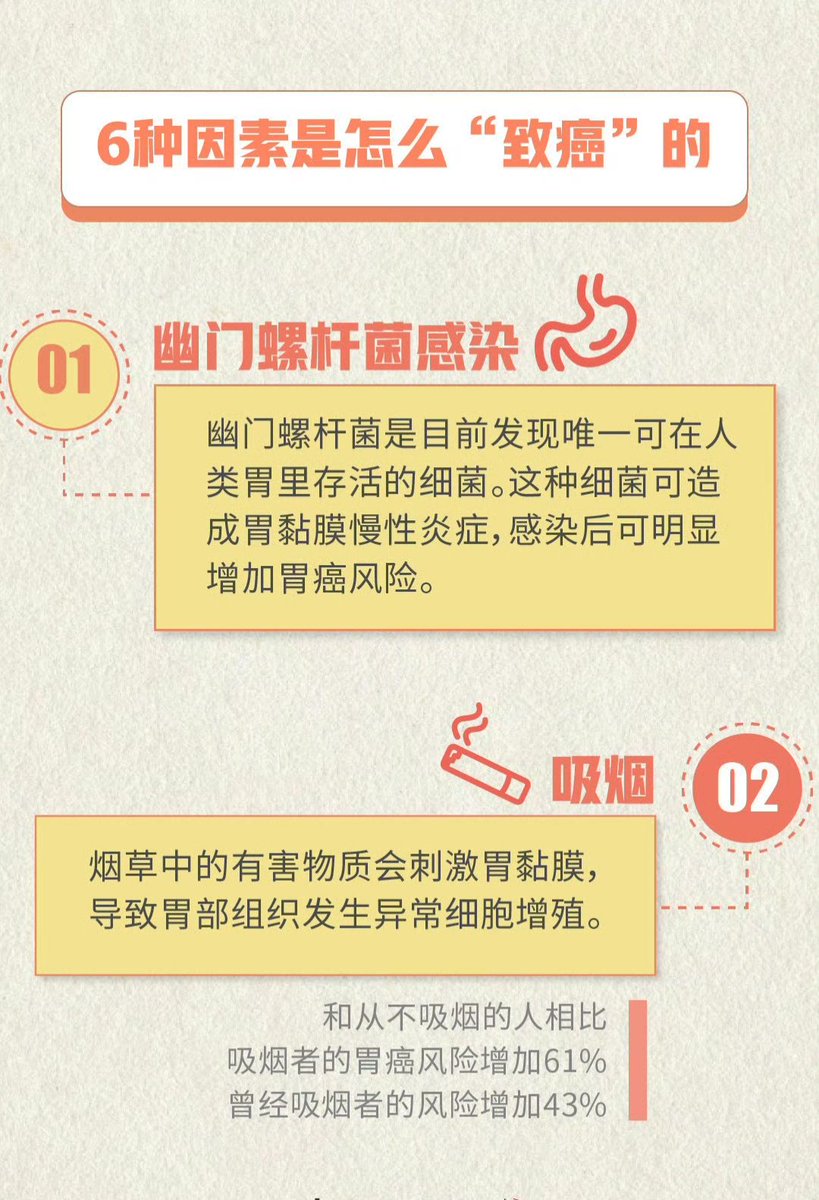 「导致“胃癌”的6个高危因素」 胃癌是一种常见恶性肿瘤,通常发生于胃的黏膜层或近壁处,如果不及时治疗,它可能会扩散到其他器官并威胁生命。 胃癌的发生率随年龄的增长而增加,一些危险因素会增加患胃癌的风险,如饮食习惯、生活方式、细菌感染和遗传等。了解胃癌的危险因素并尽量远离,对于预防和早期发现胃癌至关重要。