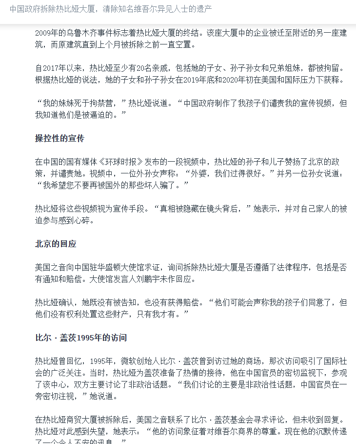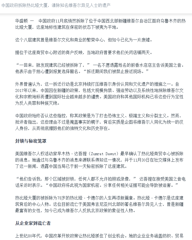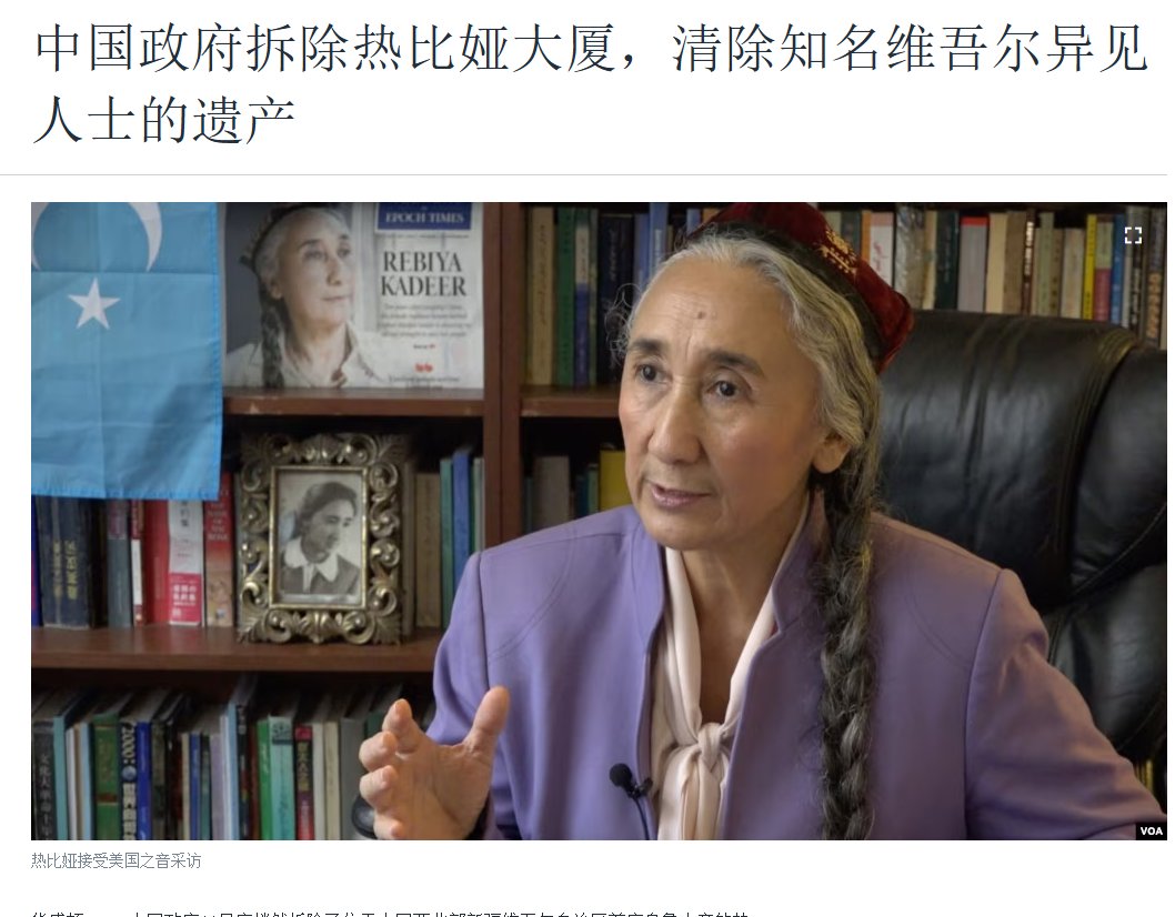 中国政府拆除热比娅大厦,清除知名维吾尔异见人士遗产。 中国于11月拆除了新疆乌鲁木齐的热比娅大厦,外界认为,这一拆迁行动是北京持续打压维吾尔身份认同和文化遗产的措施之一。 知名维吾尔异见人士热比娅·卡德尔是这座建筑背后的人物,目前已流亡美国,她曾是新疆最富有的女性,如今已成为维吾尔人反抗北京政策的象征性人物