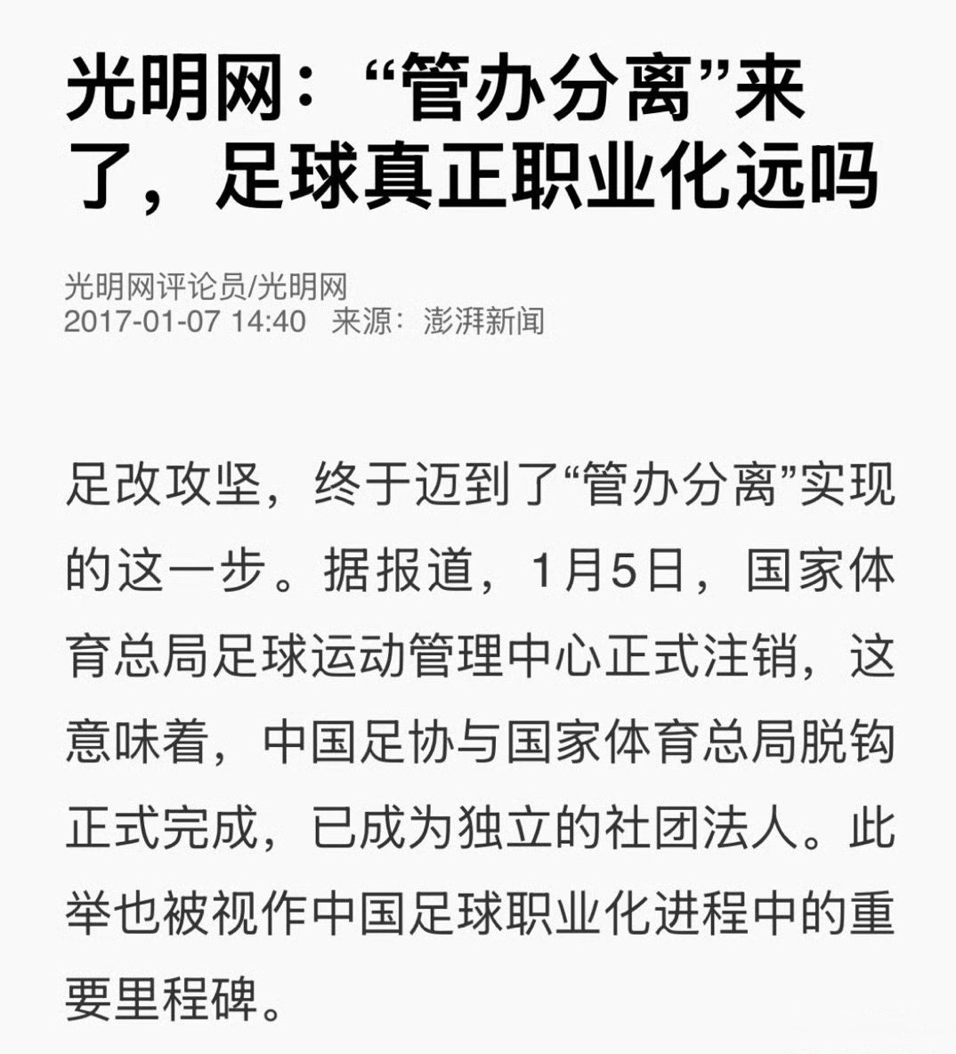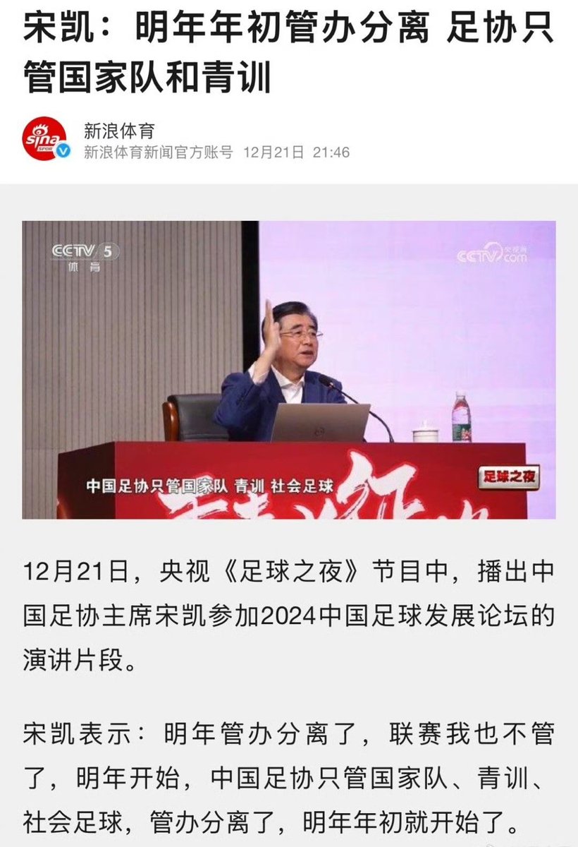 2015年报道:等了11年,中国足球管办终分离! 2017年报道:管办分离来了,足球真正职业化还远吗 2024年12月21日报道:足协主席宋凯表示:明年年初管办分离,足协只管国家队和青训。