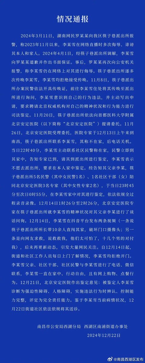 世间再无李宜雪。10亿流量的李宜雪还是被干回精神病院了,她这辈子要想活着走出精神病院只有一个条件。在墙内那条件一说出来就要销号。仙人板板,说你是“强迫性障碍、人格障碍”,又评定为完全责任能力。得有多大的仇才整得出来这样的结果?