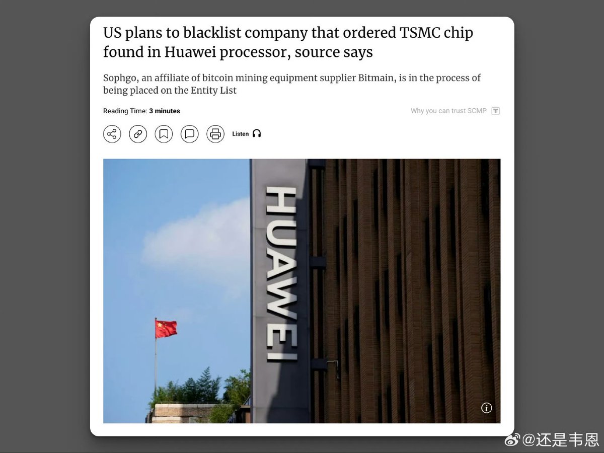 美国计划将协助华为订购台积电芯片的公司列入实体黑名单。据知情人士透露,美国计划将一家中国公司列入黑名单,该公司涉嫌非法向华为转让台积电芯片。中国公司“算能” Sophgo 因在华为 Ascend 910B 多芯片系统上发现与其从台湾半导体公司订购的芯片相匹配,而引起关注。