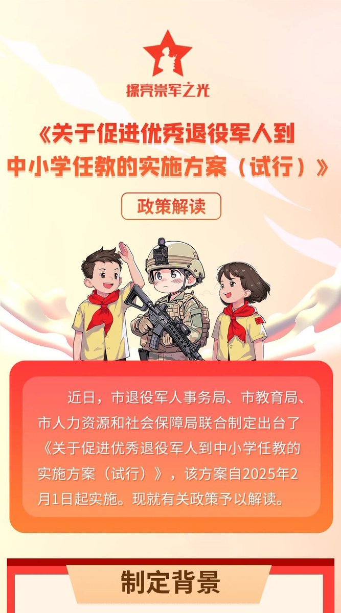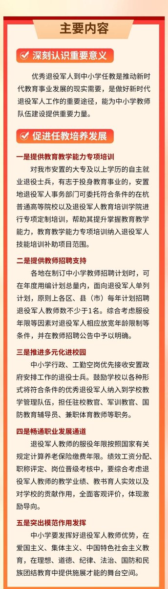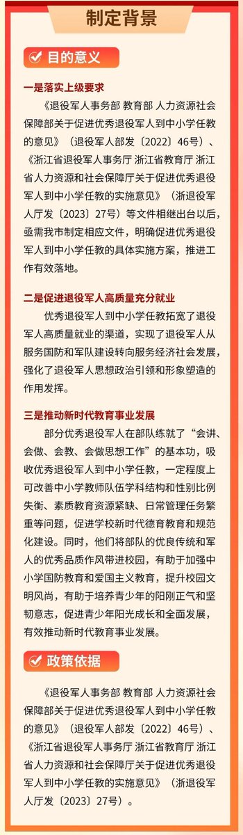 近日,杭州市发布方案,推动优秀退役军人到中小学任教。 杭州退役军人事务局:吸收退伍军人到中小学任教,有助于加强中小学国防教育和爱国主义教育; 各地在制定中小学招聘计划时,可在年度用编计划总量内,每年计划招聘退伍军人数不少于1名。
