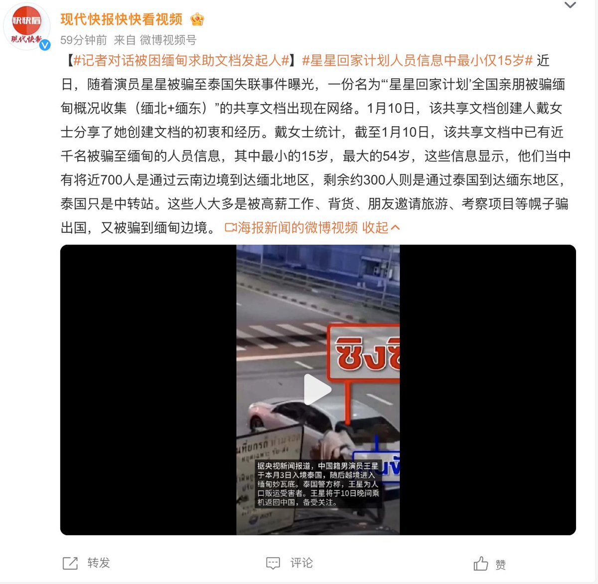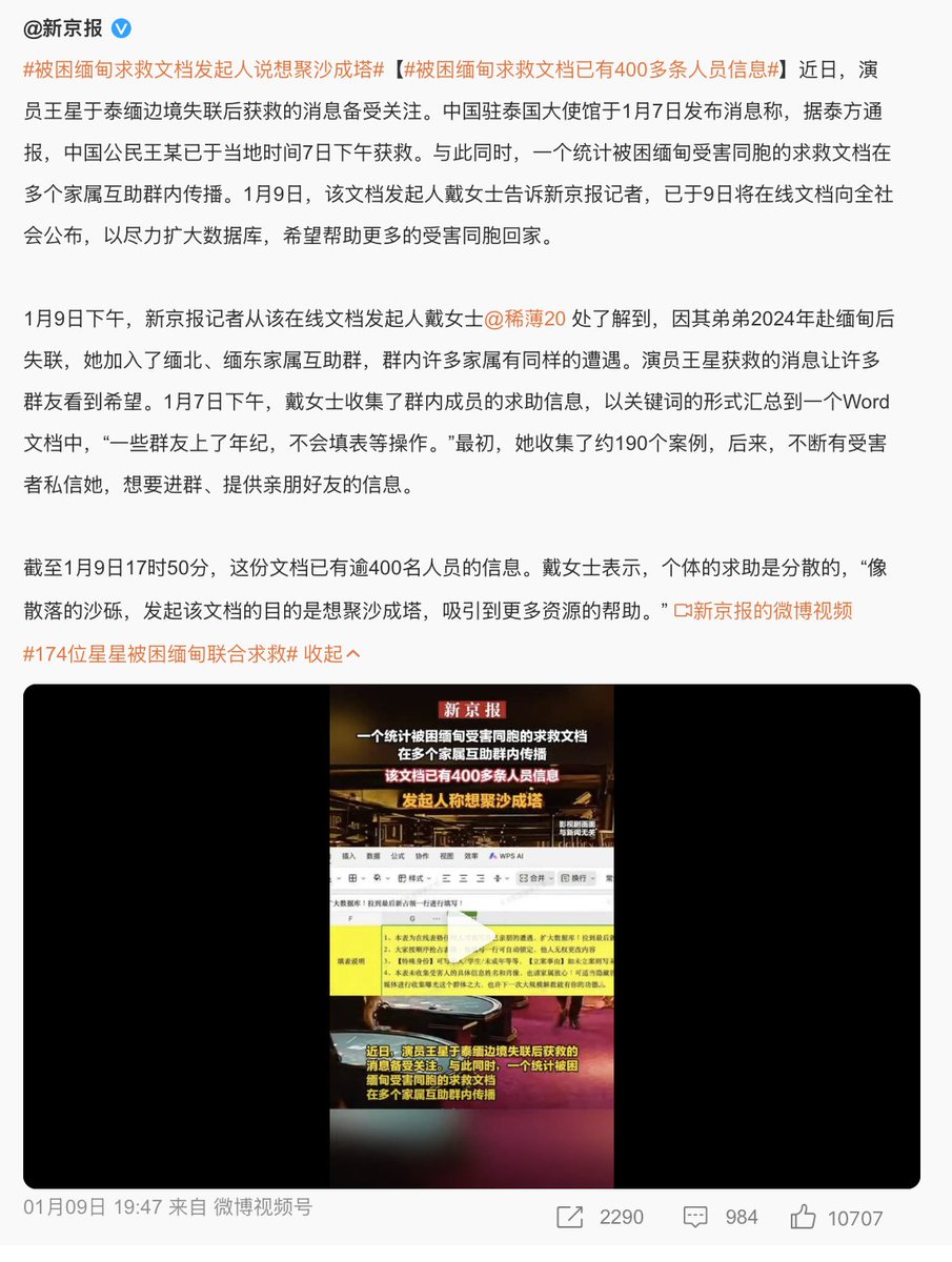 据悉,受害者家属求助的“星星回家计划”WPS文档发起人刚刚才接受过采访,被新京报和现代快报等报道。新闻显示,失踪的1000多人中,最小的仅15岁,其中有700多人是在云南边境被拐卖,300多人则是在泰国被拐卖。云南对应缅北地区,泰国对应缅东地区的人口贩卖。
