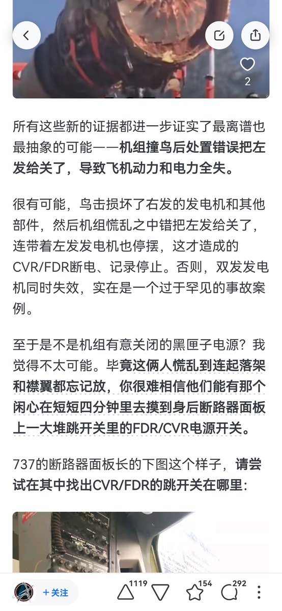 韩国坠机情况更新:最后四分钟黑匣子被关掉了没有录。所以之前的一个猜测又火爆了起来:就是撞鸟导致单发失效后,又关了另一侧好的发动机,导致飞机动力和电力全失。