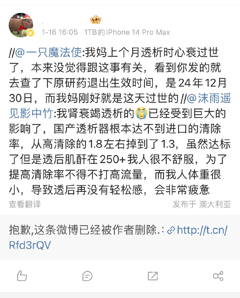 1月16日,网友吐槽:我肾衰竭透析,但国产透析器根本达不到进口的清除率。 另一名网友:“我妈上月透析时心衰去世。本来没觉得和这件事(医保集采)有关,刚才查了原研药退出生效时间,是24年12月30日,而我妈刚好就是这天去世的”