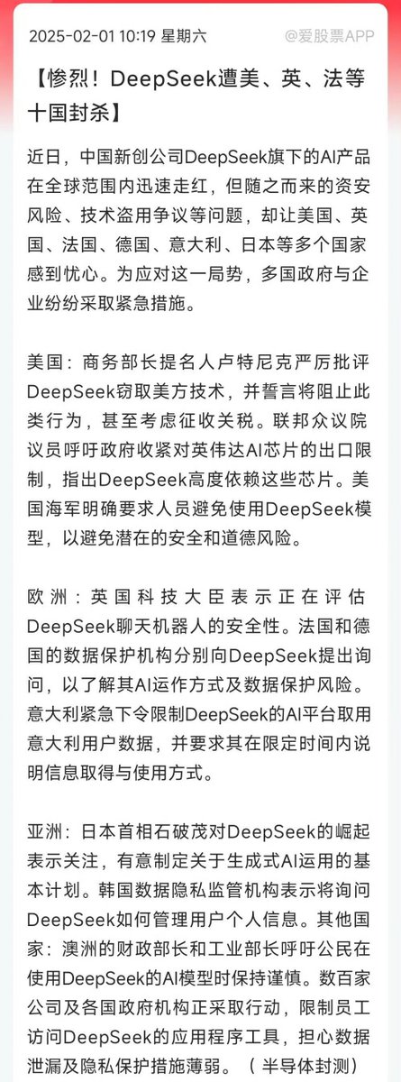 2月1日报道,DeepSeek遭到美、英、法等十国封杀。 美国:商务部长提名人卢特尼严厉批评DeepSeek窃取美国技术,并誓言将阻止此类行为,甚至考虑征收关税。 欧洲:英国科技大臣表示正在评估DeepSeek聊天机器人的安全性。意大利紧急下令限制DeepSeek取用意大利用户数据......