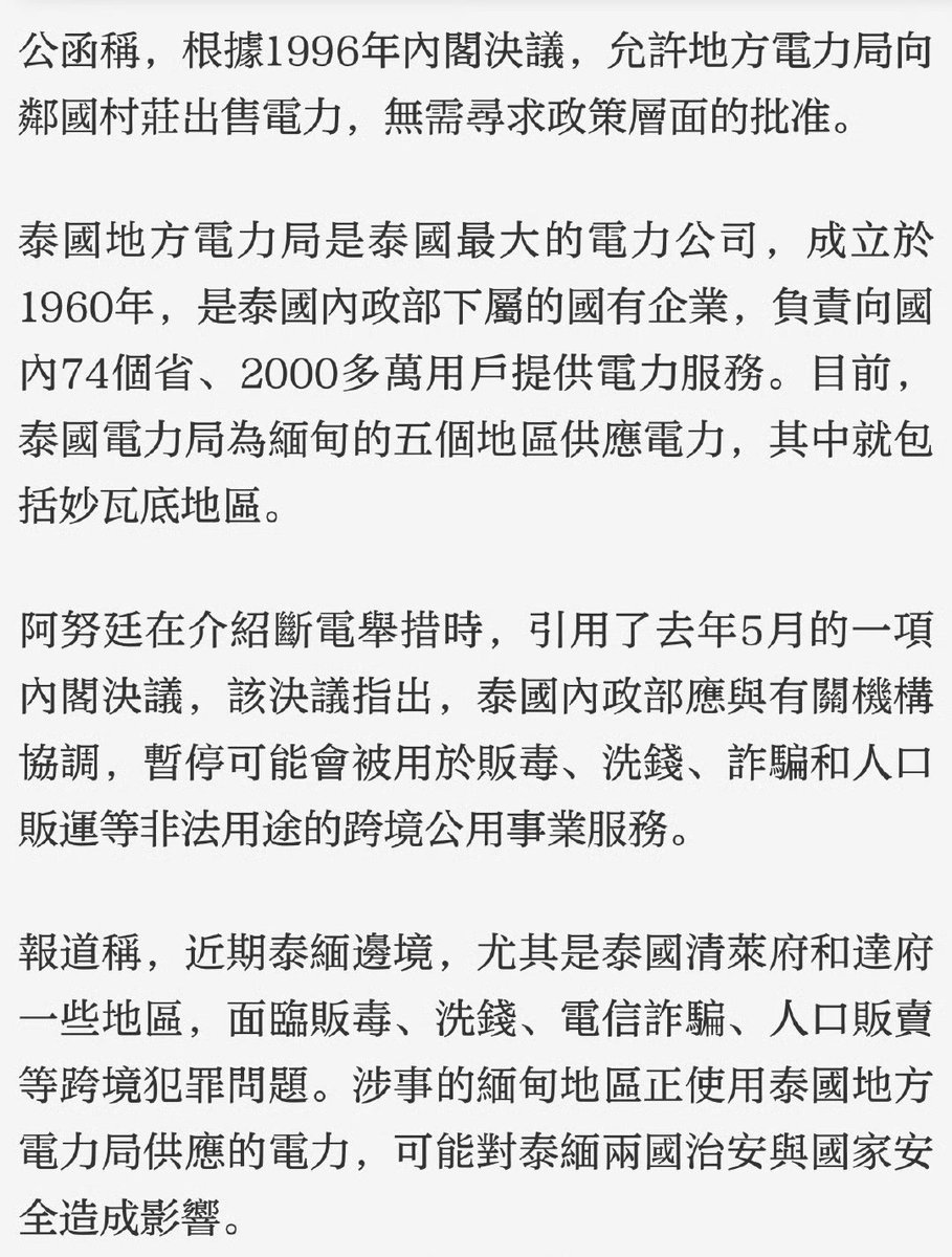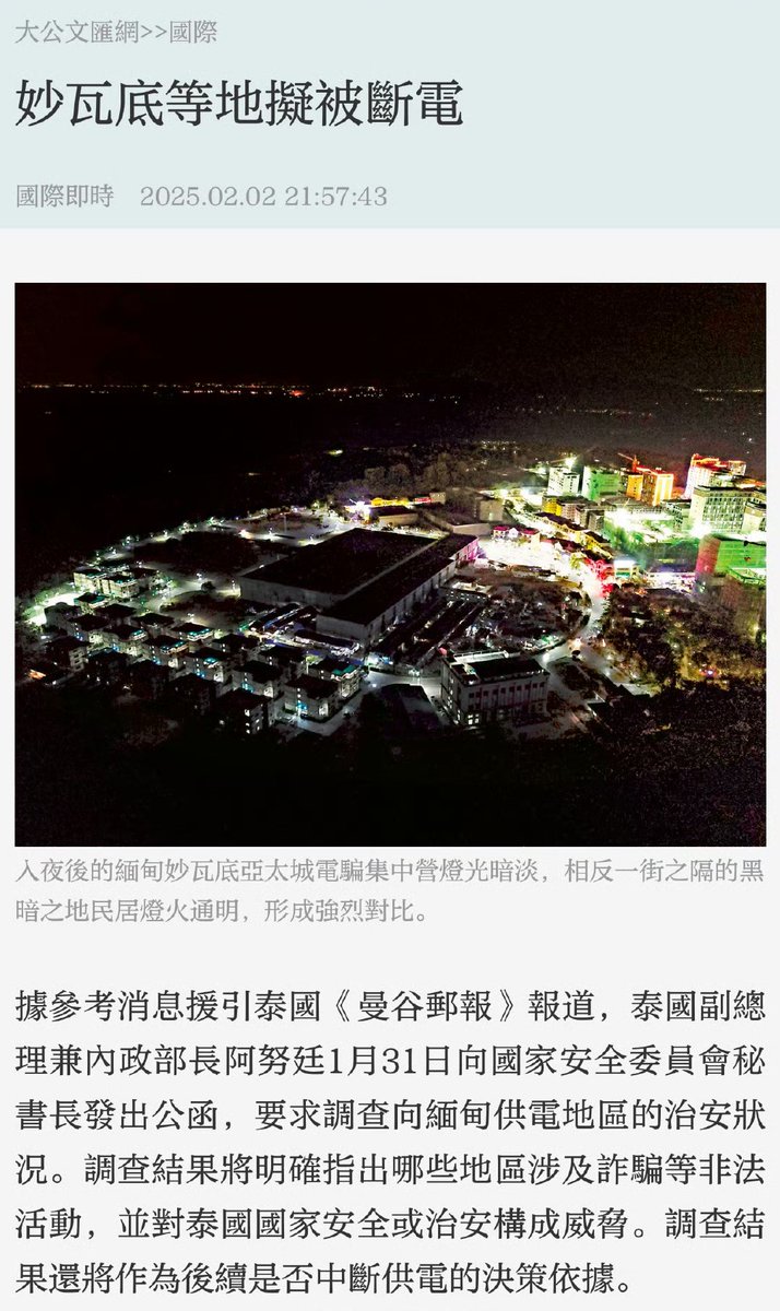 泰国拟对缅甸边境妙瓦底等地区切断供电。 泰国副总理阿努庭,1月31日已要求国家安全委员会调查向缅甸供电地区的治安情况,调查结果将明确指出哪些地区涉及诈骗等非法活动,并对泰国国家安全构成威胁,调查结果还将作为后续是否中断供电的决策依据。