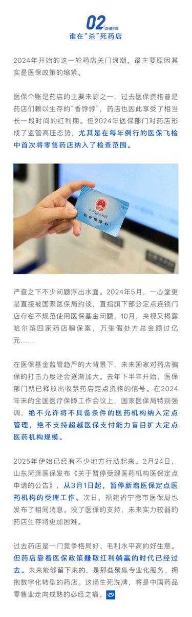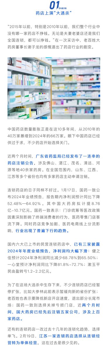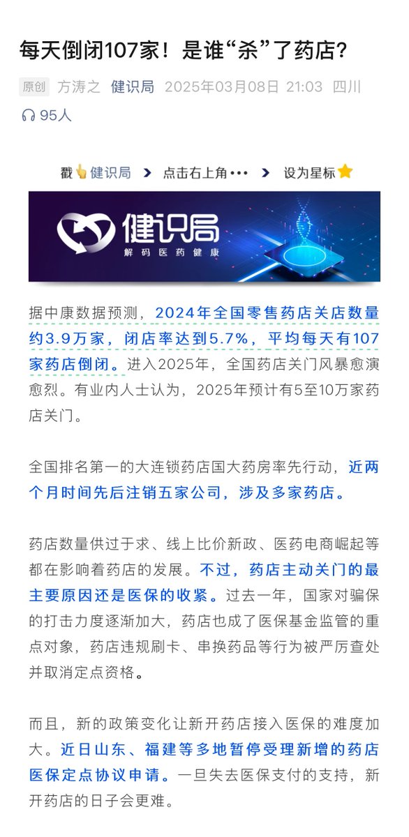中国药店陷入关店潮,公众号“健识局”:去年全国零售药店倒闭数量约3.9万家,闭店率达到5.7%,平均每天有107家药店倒闭。 根据行业预测,2025年预计将有5万至10万家药店关闭,市场竞争愈加激烈。 除了药店数量供过于求,电商崛起等影响外,药店关门最主要的原因还是医保收紧。国内六大上市民营连锁药店中,已有三家披露去年年度业绩预告,净利润大幅下滑。为了在大逃杀中生存下来,不少连锁药店不得不停止扩张。