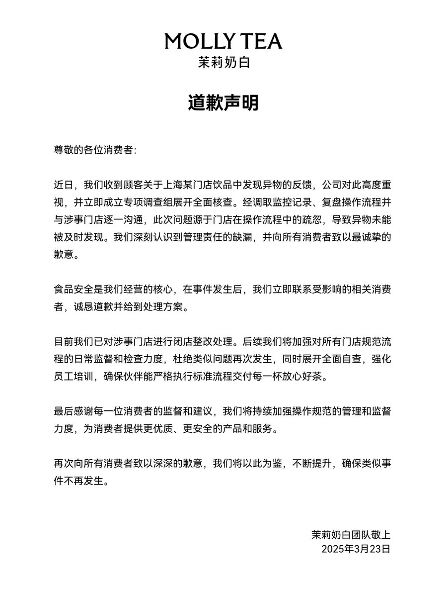 3月22日 有消费者发现其茉莉奶白购买的奶茶里面有一整个透明塑料袋,袋子上还有茉莉奶白的产品标签。3月23日 茉莉奶白在其微博发布声明道歉,称此次事件源于门店操作流程的疏忽,涉事门店已经闭店整改。当事人称:其已收到1000元赔偿,但后续也需要门店给予交代,奶茶里为何会有这么大的塑料袋