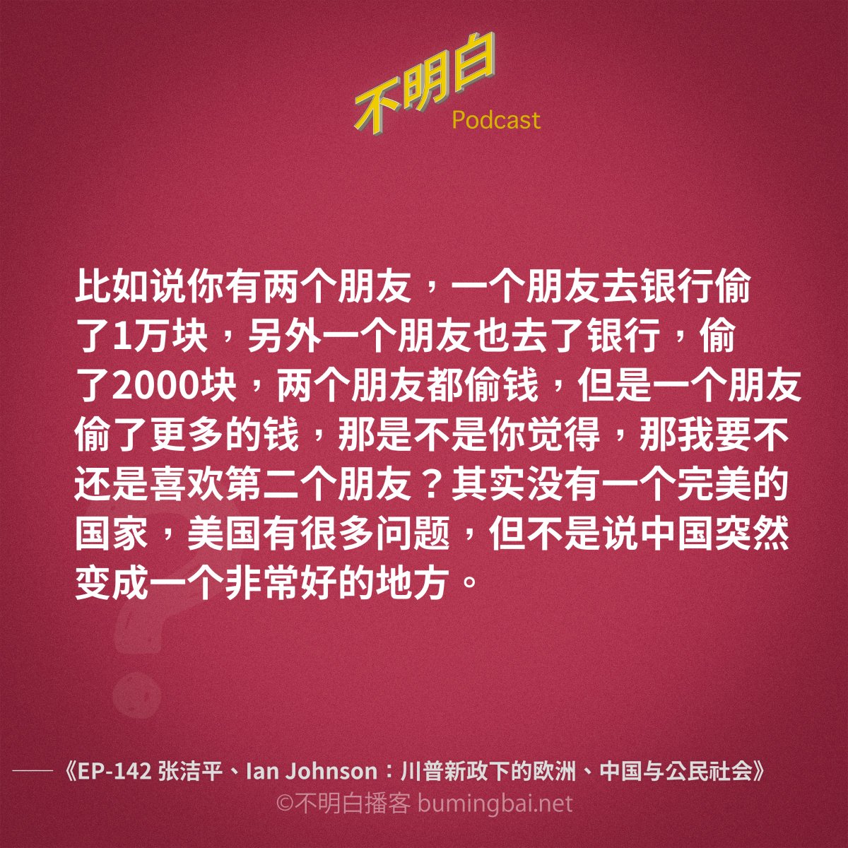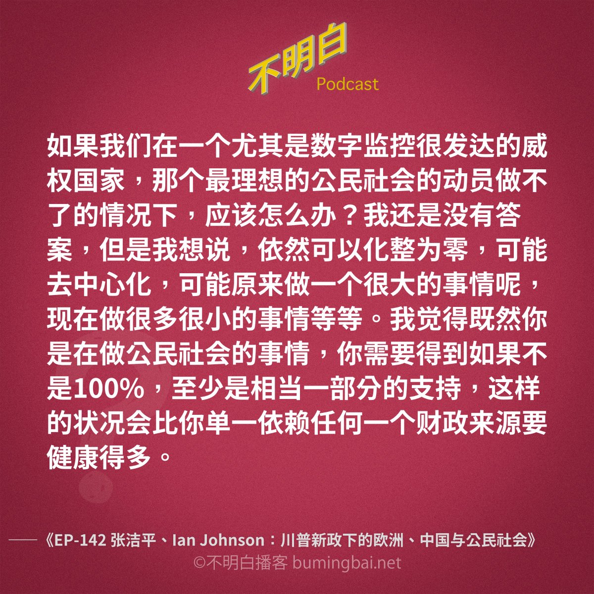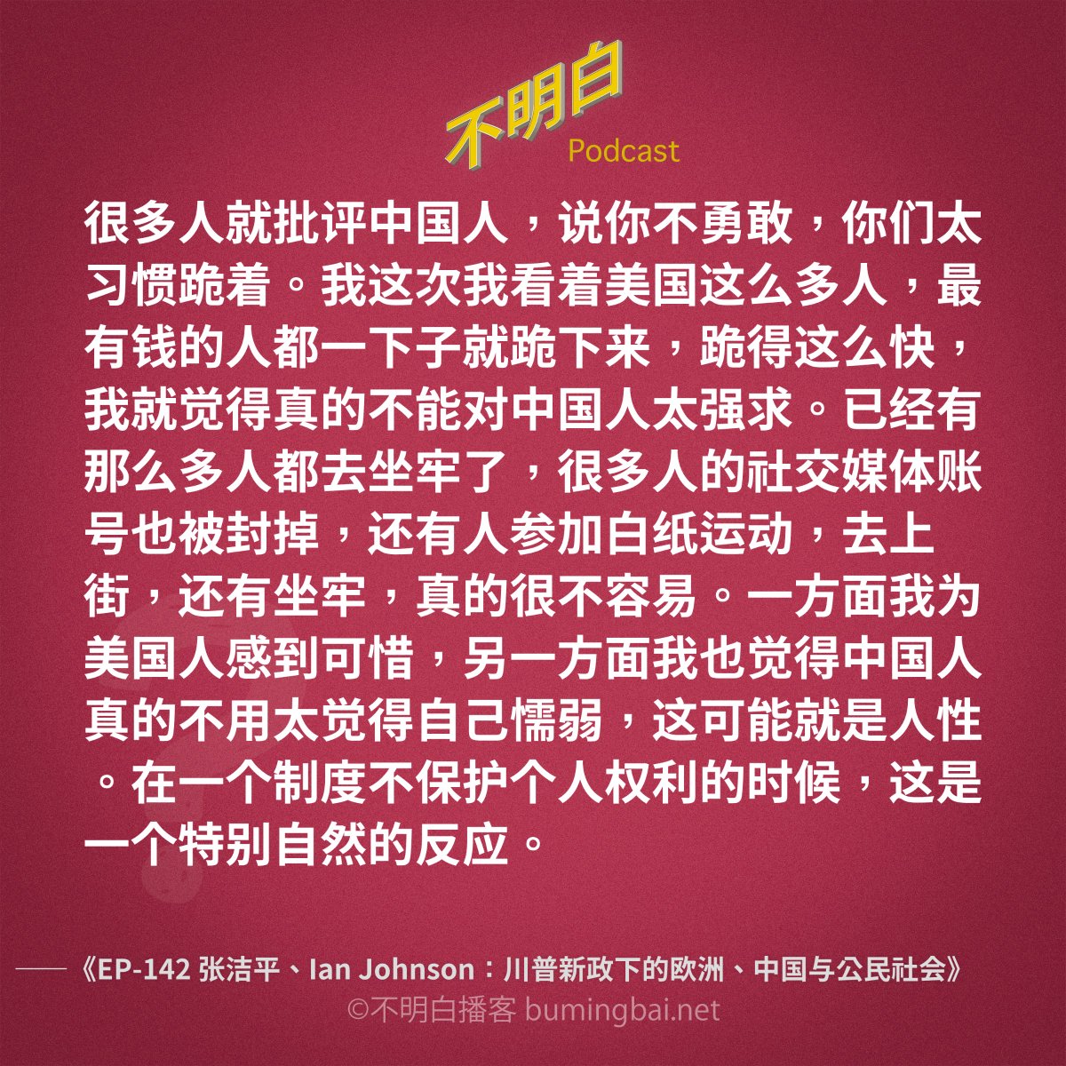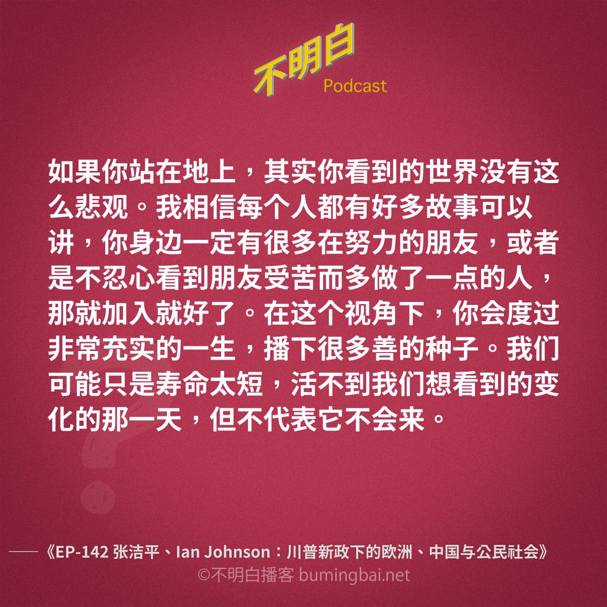 很欣赏洁平的态度。我们坚持一种价值观,包括政治价值,不是因为在我们有生之年它能变成现实,而是因为它本身的价值,就是让我们活得更像人。这是一种世俗信仰,像基督徒相信复活和末日审判一样。