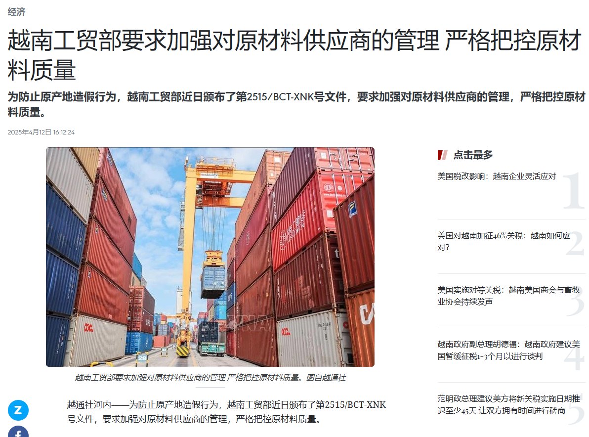 为了防止原产地造假行为,越南工贸部近日颁布文件,要求加强对原材料供应商的管理,严格把控原材料质量。