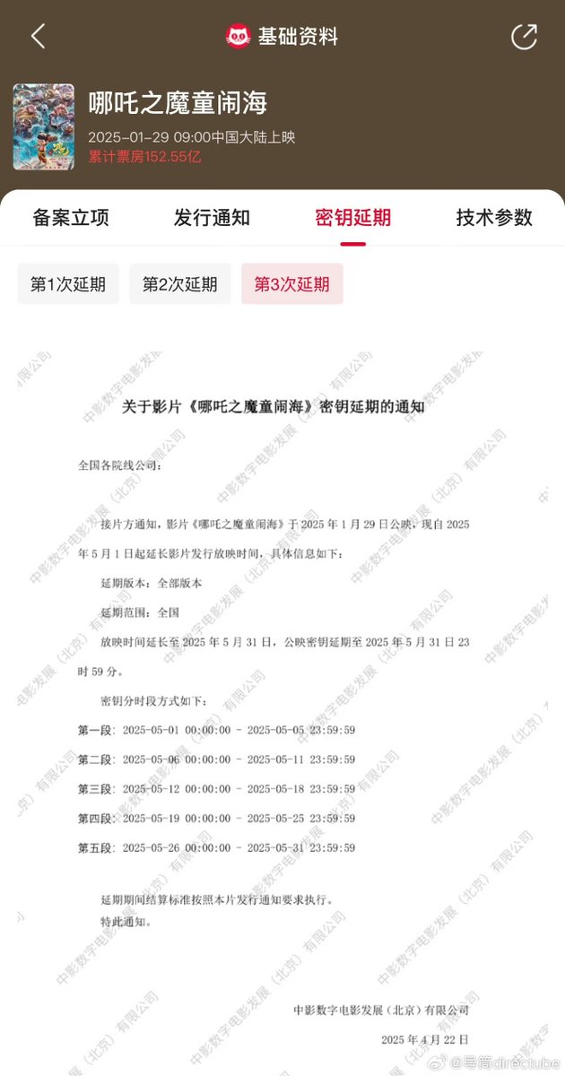 《哪吒之魔童闹海》 密钥第三次延期,延长上映至5月31日,截至当前该片全球票房已超157.03亿。