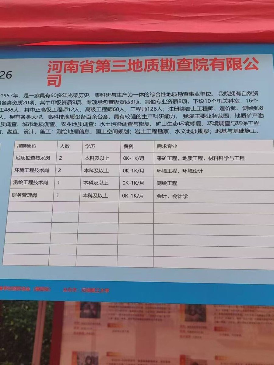 网友投稿4月22日,河南理工大学春招,河南省第三地质勘查院有限公司提供的薪资:0到1k。