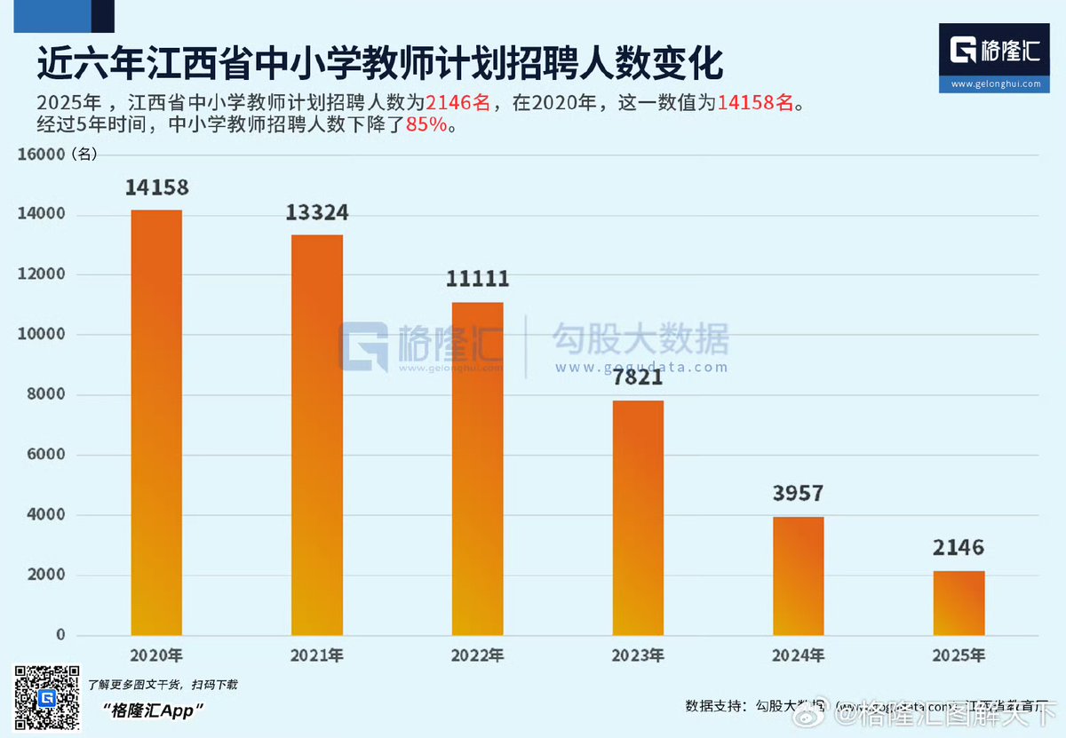2025年,该省计划招聘中小学教师人数为2146名,短短五年时间,招聘人数下降了85%
