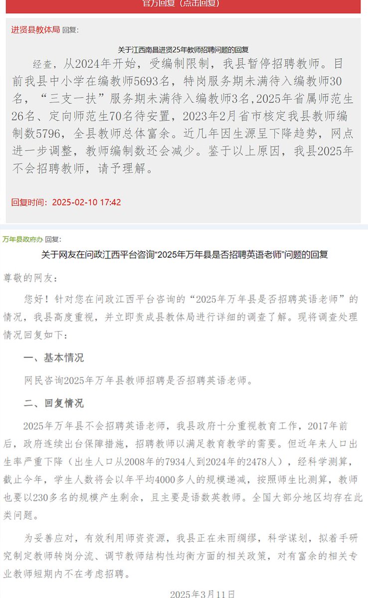 3月11日,江西万年县政府办回复民众:近年人口出生率严重下降,学生人数将会以年均4千多人的规模递减,教师也要以230多名的规模产生剩余,因此今年万年县不会招聘英语老师。我县正拟制定教师转岗分流等政策。