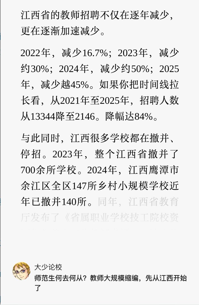 与此同时,江西很多学校都在撤并、停招。2023年,整个江西省撤并了700余所学校。2024年,江西鹰潭市余江区全区147所乡村小规模学校近年已撤并140所。