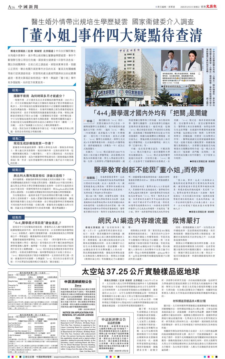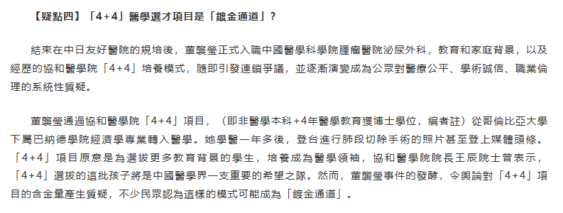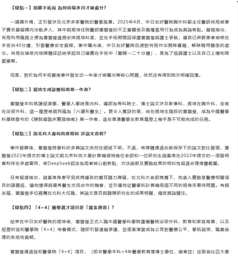 香港文汇网用几乎整个版面来报道董小姐事件,还提出四大疑点:1:擅离手术岗,为何时隔数月才处分?2:规培生也能成诊疗指南第一作者?3:与北科大专利高度相似,涉论文造假?4:协和4+4医学选材项目是“镀金通道?”