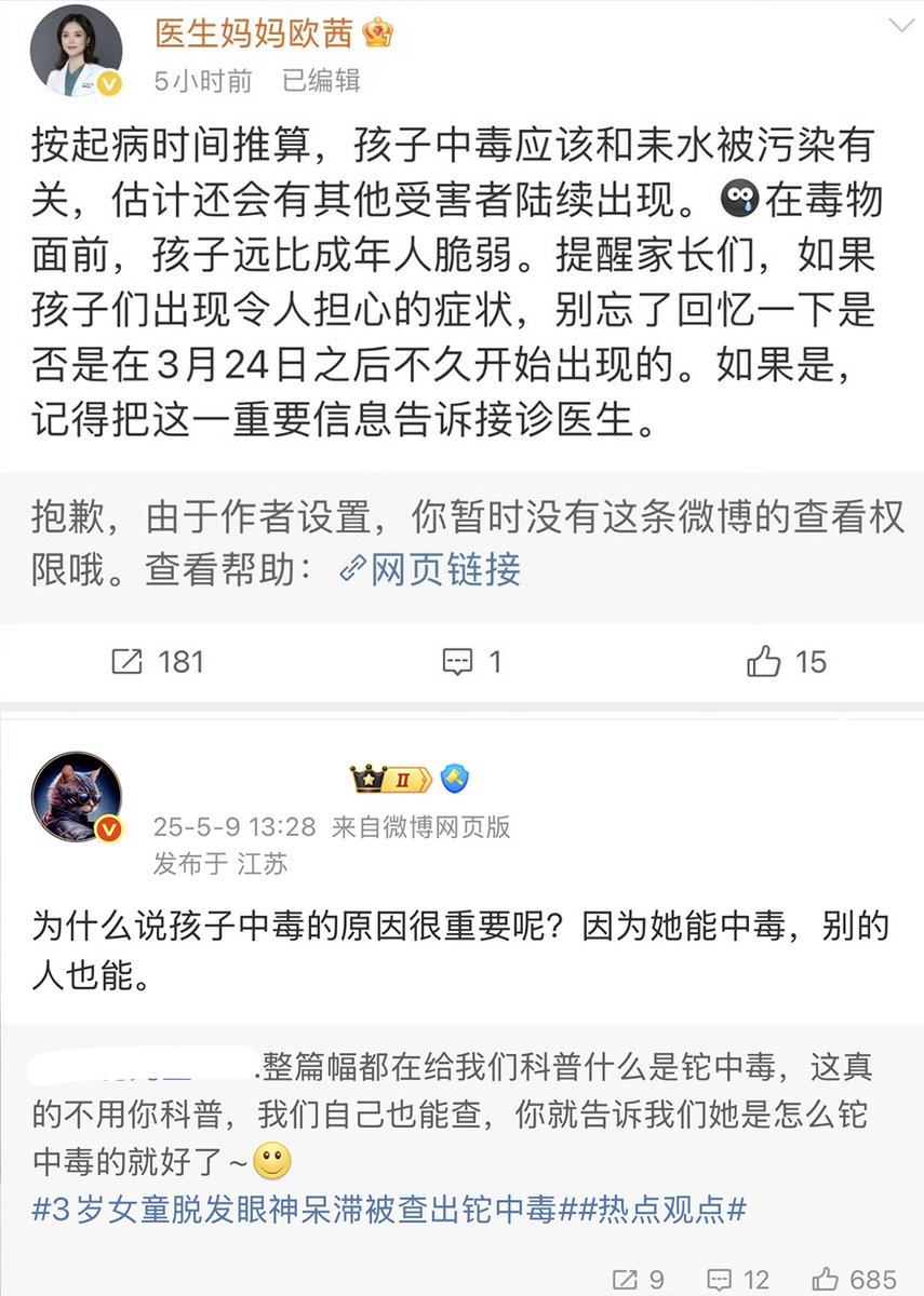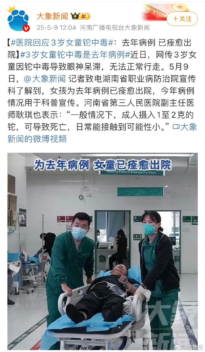 5月8日,潇湘晨报:近日,湖南刘女士3岁女儿因不明原因眼神呆滞,无法正常走路,头发也大把大把掉,经检测孩子血铊、尿铊值均远超标,确诊为急性铊中毒。广州一名儿科医生质疑:按发病时间推算,孩子中毒应该和湖南耒水被污染有关,她估计还会有其他受害者陆续出现。该事件在引起热议后,潇湘晨报删掉了报道。 5月9日,大象新闻又报道称,系去年病例,孩子已痊愈出院。不过上述媒体在报道中均未提到孩子为什么会铊中毒,全篇几乎都在科普什么是铊中毒。