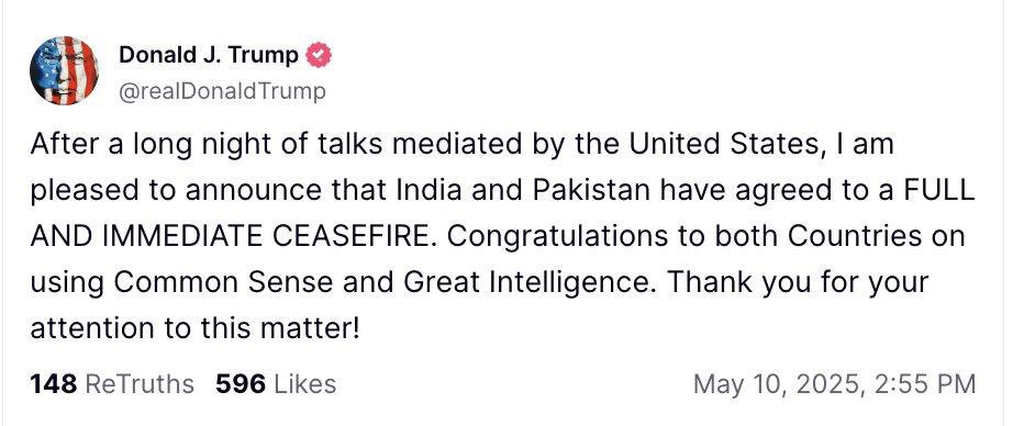 特朗普表示,經過美國斡旋的漫長一夜談判,印度和巴基斯坦已同意立即全面停火。