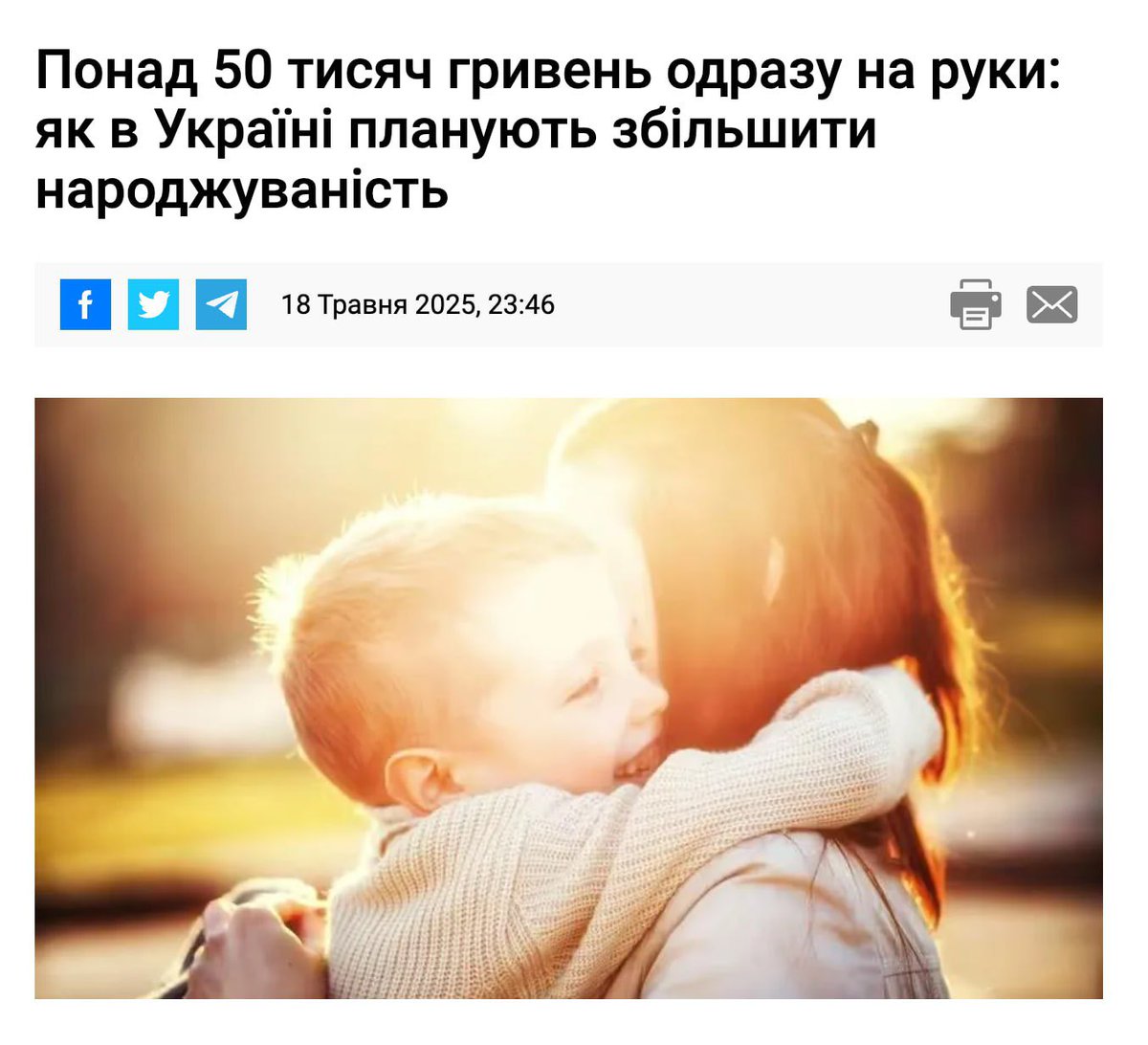 你生孩子50,000 烏克蘭格里夫納直接到您手中,每個月還有額外補助,烏克蘭希望增加對每個孩子出生時的援助,50000付款一次性發放。