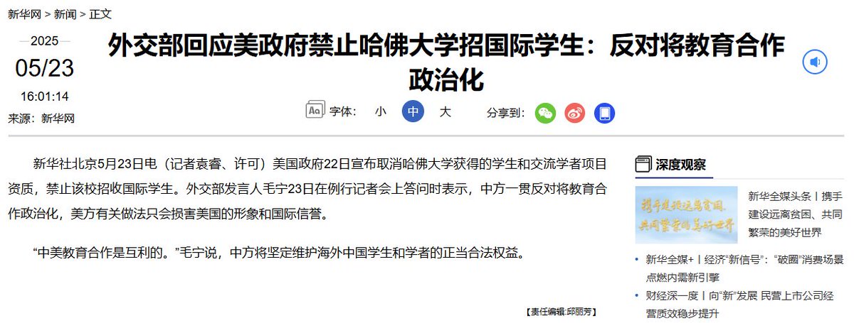 23日的外交部例行记者会上,毛宁回应:中美教育合作是互利的,中方一贯反对将教育合作政治化,美方有关做法只会损害美国的形象和国际信誉。中方将坚定维护海外中国学生和学者的正当合法权益。
