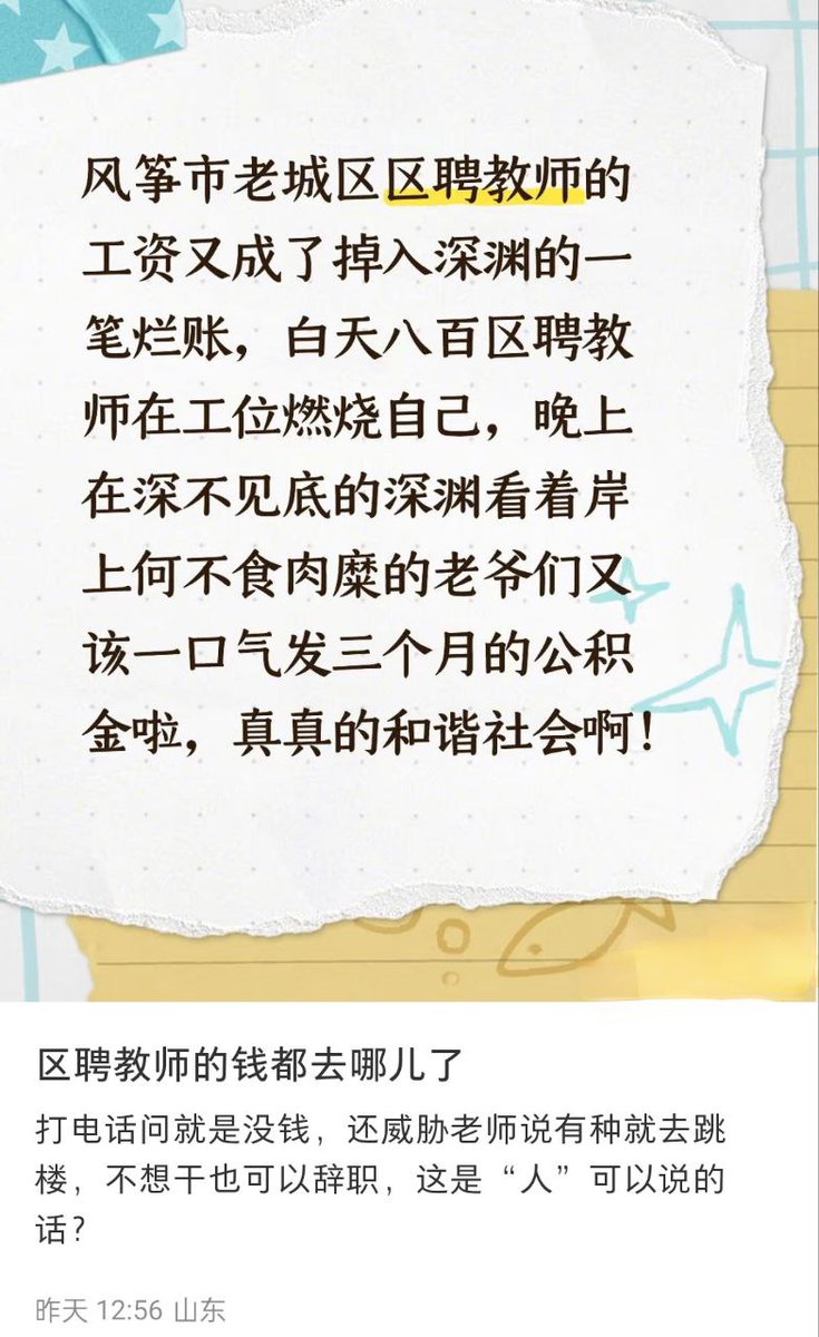 5月29日,一博主吐槽风筝市(山东潍坊)老城区,区聘教师的工资又成了掉入深渊的一笔烂账,白天八百区聘教师在工位燃烧自己,晚上在深不见底的深渊看着岸上何不食肉糜的老爷们又该一口气发三个月的公积金啦。区聘教师的钱都去哪儿了?