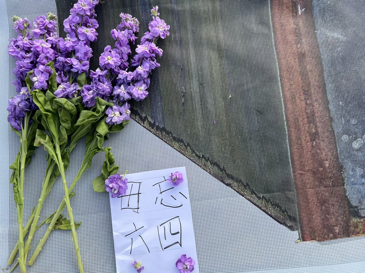 #六四大屠杀三十六周年 #紀念六四逝者 活動开始前,一位年輕的男士送來紫色花束和一张写有毋忘六四的紙,然後他就離開了。感謝這些記得的人