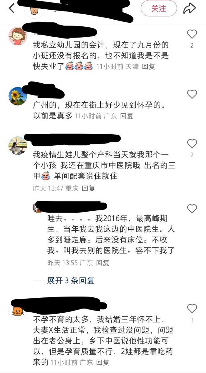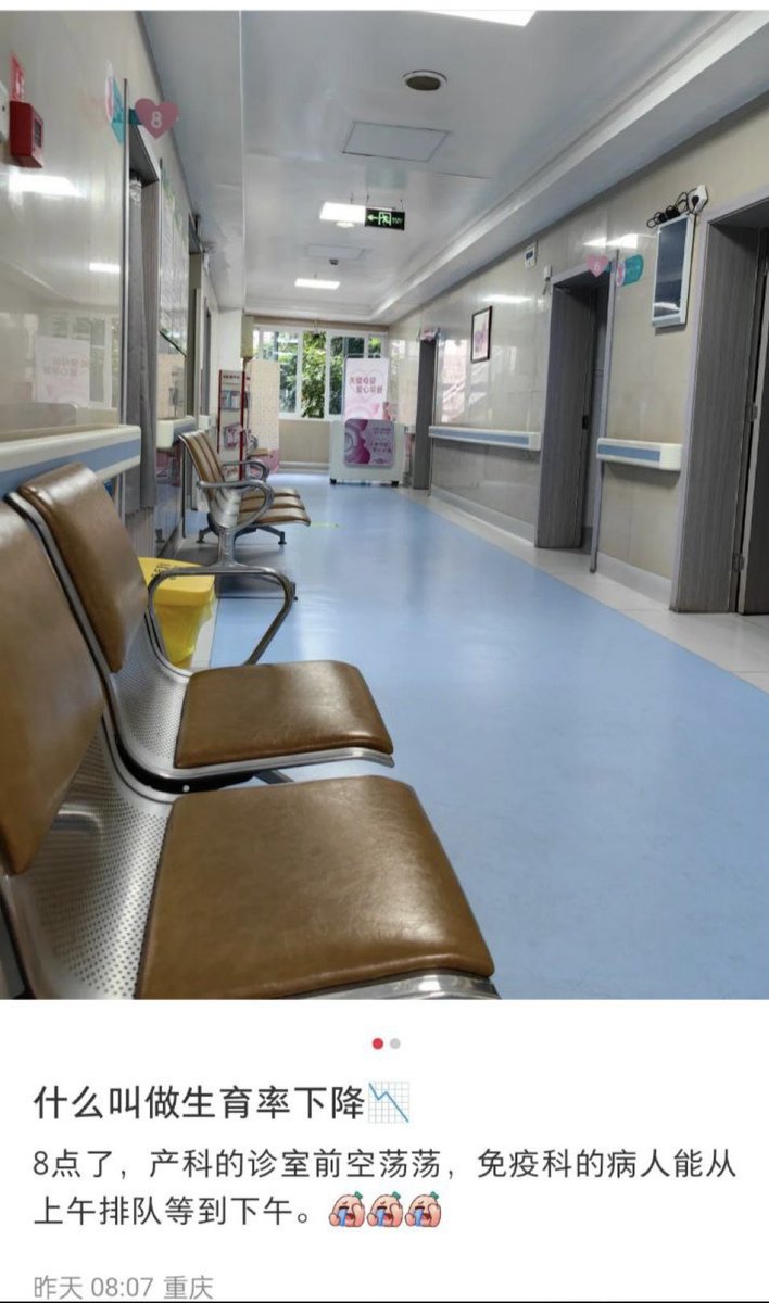 6月23日,重庆,一博主分享生育率下降现状,早上8点,产科的诊室前空荡荡,免疫科的病人能从上午排队等到下午。评论区不少网友分享自己的观察:“以前妇产科走廊都住满了人,现在三甲医院妇产科单人单间随便住”“县里小学今年新生只招到了一个学生”“我私立幼儿园的,到现在九月份小班还没有报名的”