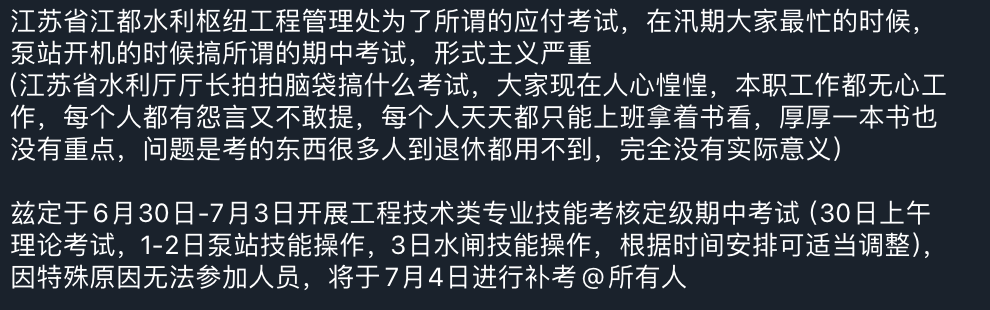 网友投稿:江苏江都水利枢纽工程管理处在汛期最忙的时候要求员工参加充满形式主义的期中考试,搞的人心惶惶无心工作。“江苏省水利厅长拍拍脑袋搞什么考试,大家现在人心惶惶,本职工作都无心工作,每个人天天都只能上班拿着书看,厚厚一本书也没有重点,问题是考的东西很多人到退休都用不到”