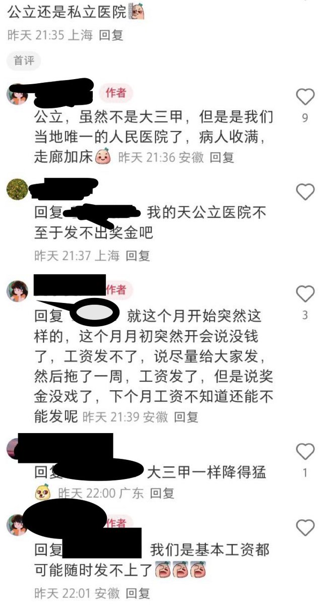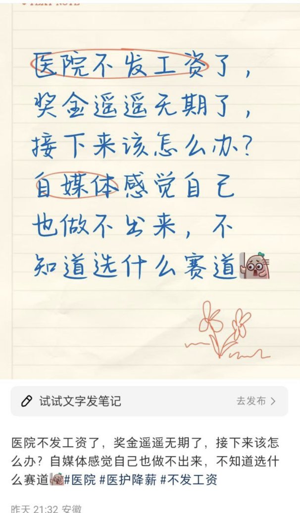 6月26日,安徽,一博主吐槽公立医院不发工资了,奖金也遥遥无期了,接下来该怎么办?自媒体感觉自己也做不出来,不知道选什么赛道。该博主所在医院为当地唯一的人民医院,就算病人收满到走廊要加床,依然发不出工资。
