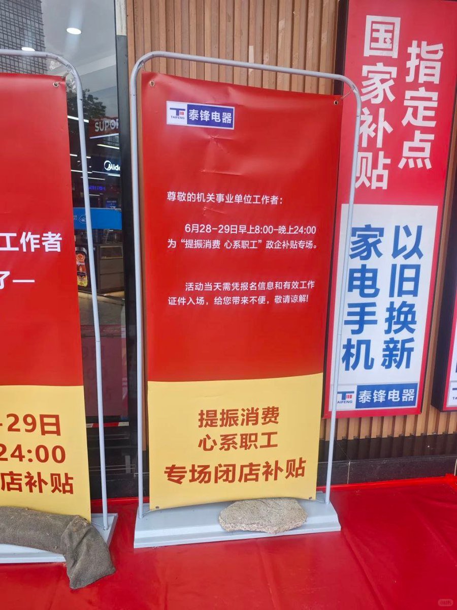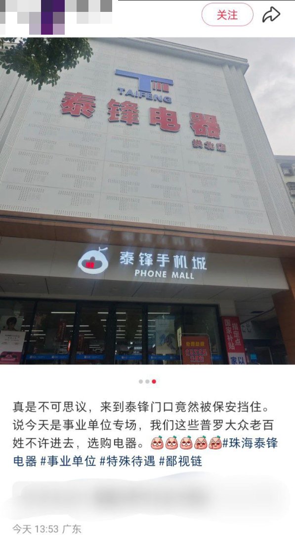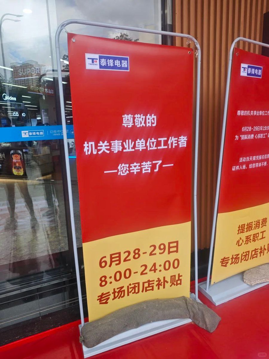 6月28日,广东泰锋电器商城,博主想进去购物,结果在门口竟然被保安挡住,被告知今明两天是事业单位专场。商场门口的宣传标语上写着,“尊敬的机关事业单位工作者,您辛苦了”。