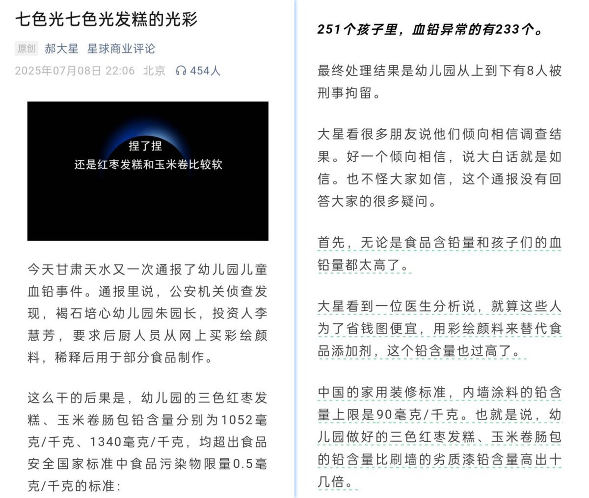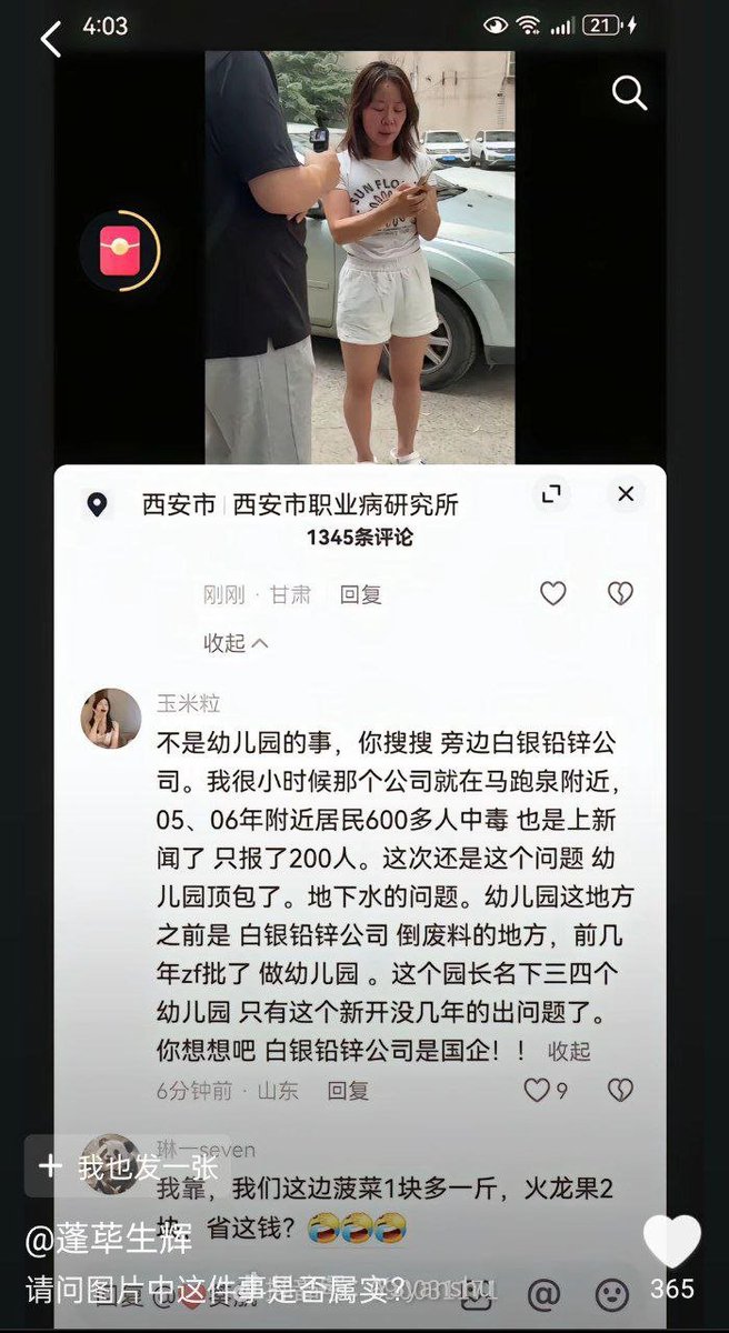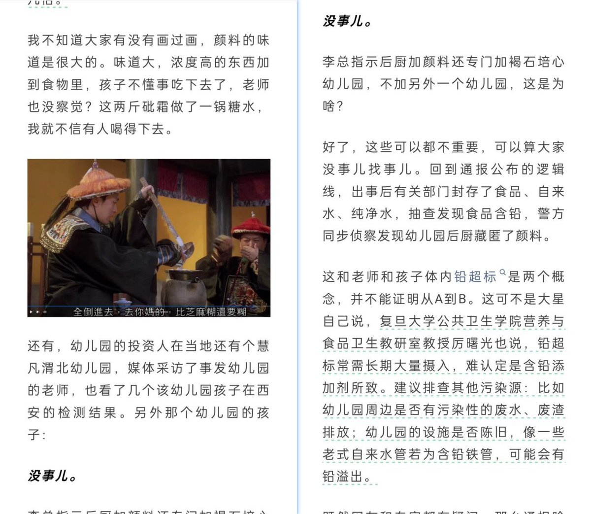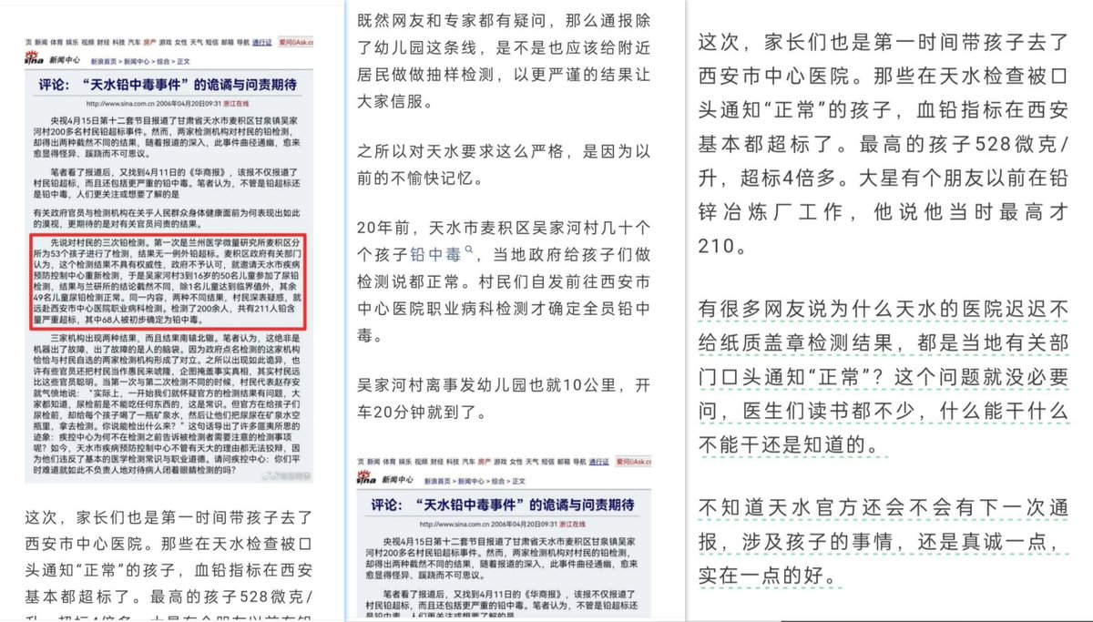 有博主在微信公众号上针对这一点,给出了逻辑更严谨的合理怀疑。涉事幼儿园园长开的其他两家幼儿园都没事,只有这一家幼儿园幼儿集体铅中毒。而这家幼儿园离20年前天水那场幼儿集体铅中毒的发生地只有10公里。很难说没有关联性。 在网上也有其他网友补充:幼儿园所在地之前是国企铅锌公司倒废料的地方。