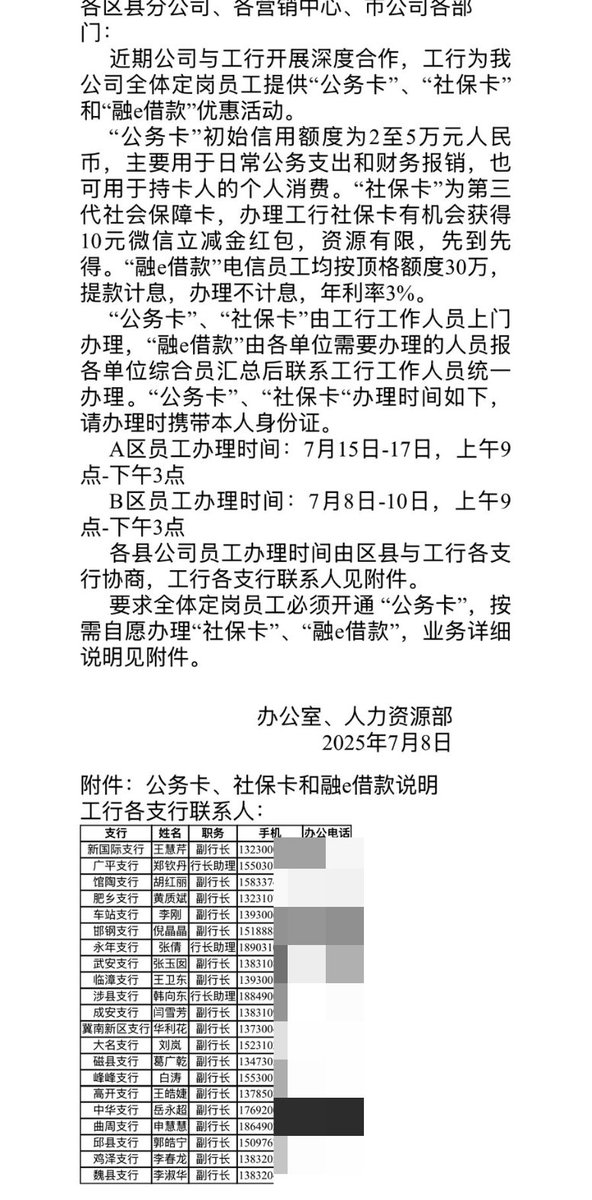 7月8日,河北邯郸电信公司要求员工必须办理指定工商银行信用卡、贷款和社保卡。网友表示,完成一户,领导可以拿上千元提成。