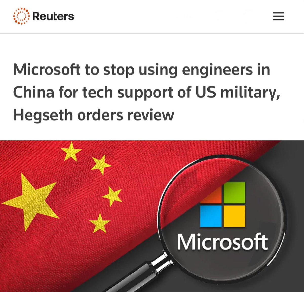 美國防部禁止微軟將有關美軍項目讓在中國的工程師介入。時至今日才有這種禁令,反映美國人心真大。