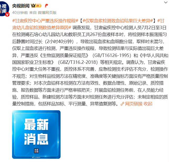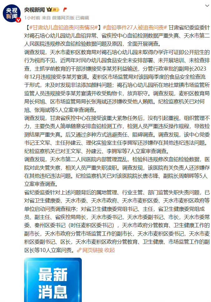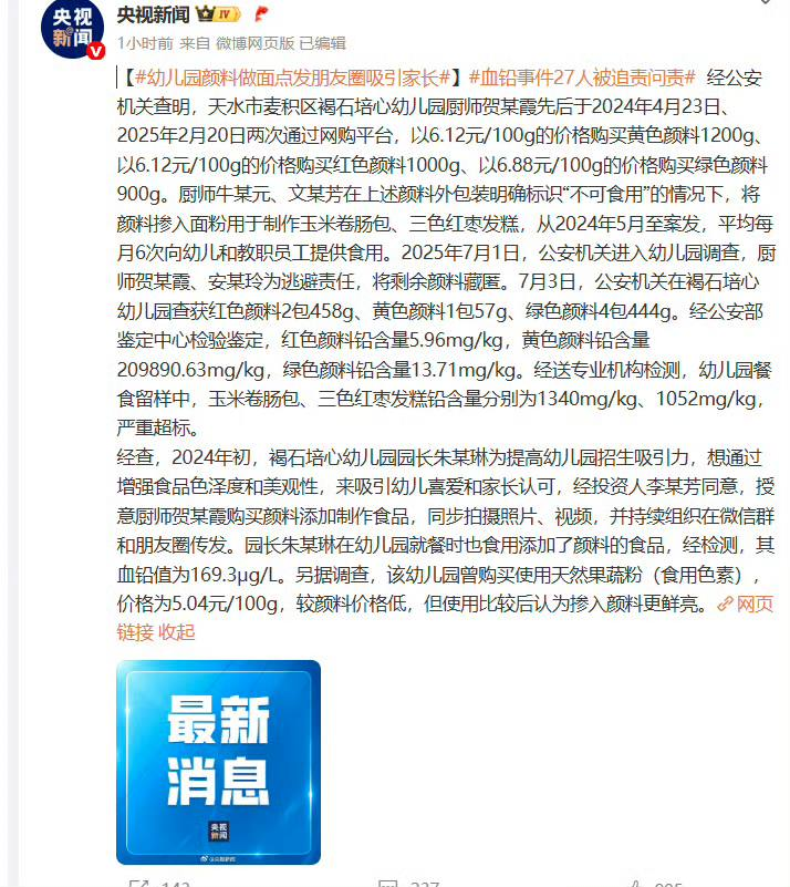 7月19日,央视新闻发布了对天水幼儿铅中毒事件的一系列调查报告:确认天水第二人民医院修改过血铅检测数据,同时报告还提到,2024年11月其实就做过检测,发现血铅指标异常,但没有发出预警。报告同时确认,甘肃省疾控中心阻碍检测,运用不规范的检测方法把血铅检测的很低,相关官员现已被立案调查。 报告还解释了幼儿园为什么有更便宜的食物色素不用,而使用工业颜料:系幼儿园认为工业颜料颜色更鲜亮美观,能够吸引幼儿喜爱,方便招生。