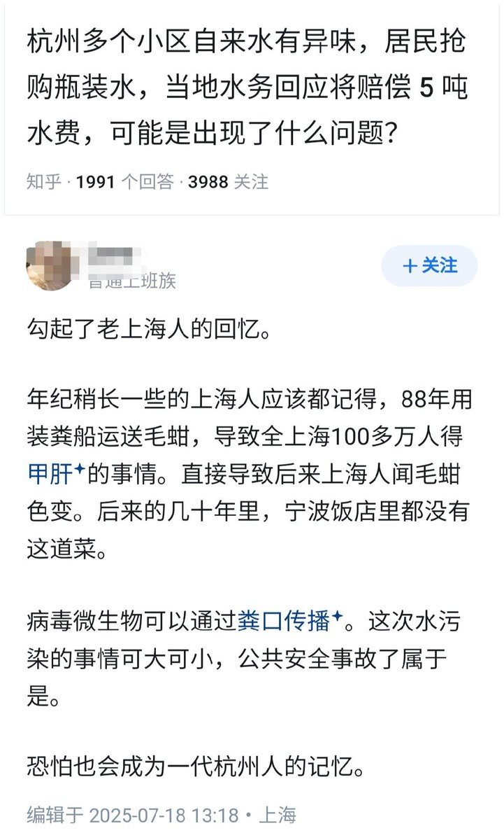 杭州余杭多个小区自来水有异味,居民抢购瓶装水,当地水务回应将赔偿5吨水费,可能是出现了什么问题?上海人的回答。👇