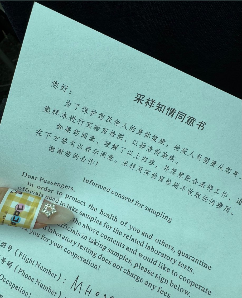 8月16日,有日本网友落地广州后,被机场检疫人员要求签署“采样知情同意书”。