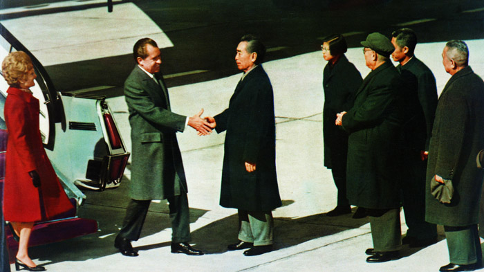 在还没完全走到舷梯下面时,尼克松总统就远远地朝周恩来总理伸出右手——据说此行前尼克松曾经仔细研究过历史,知道当年杜勒斯不肯和周总理握手的事情。尼克松的举措就是要向全世界表示,此行是美国主动的。